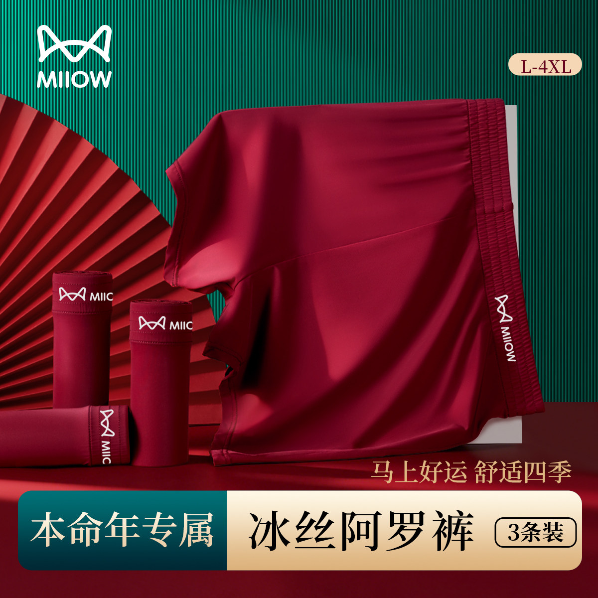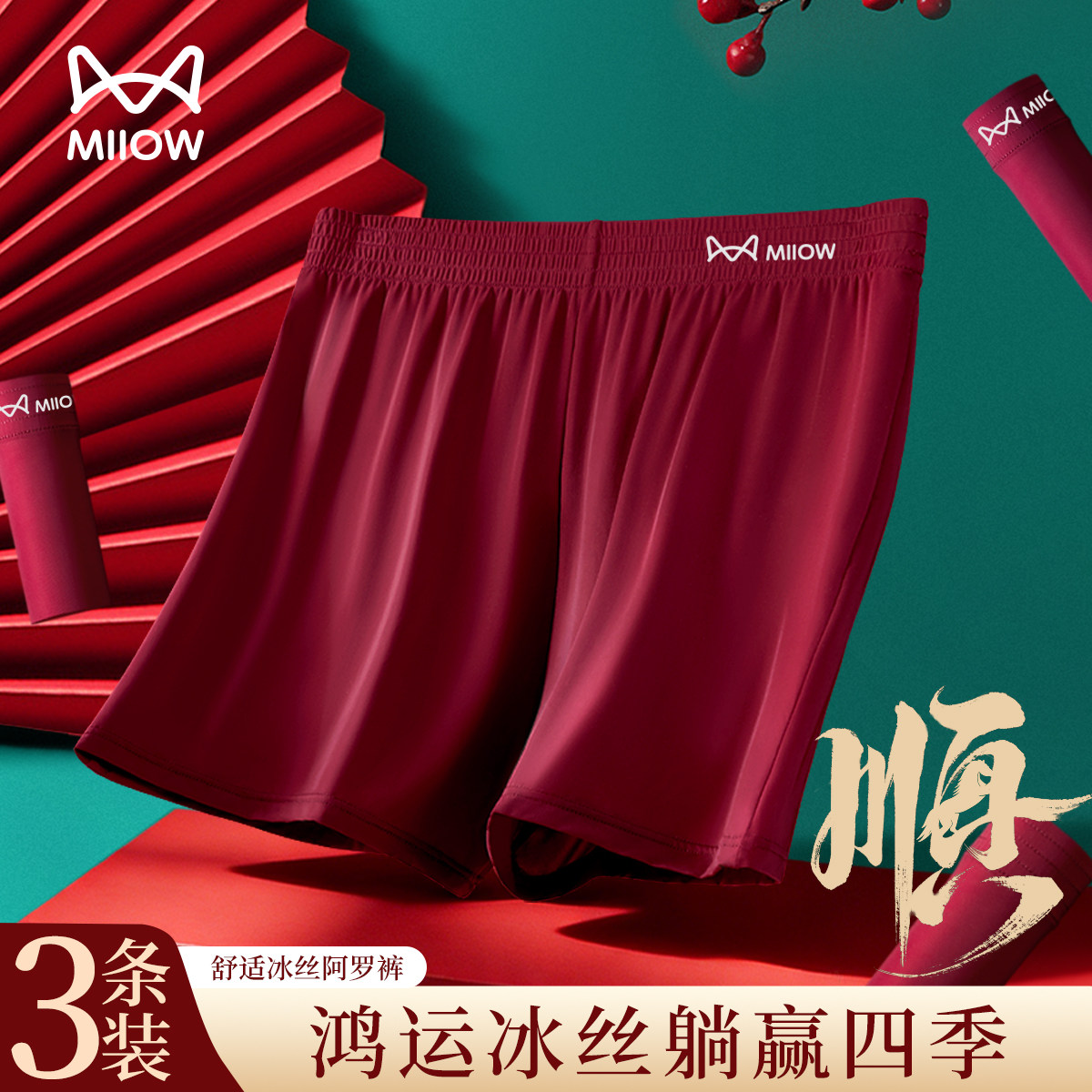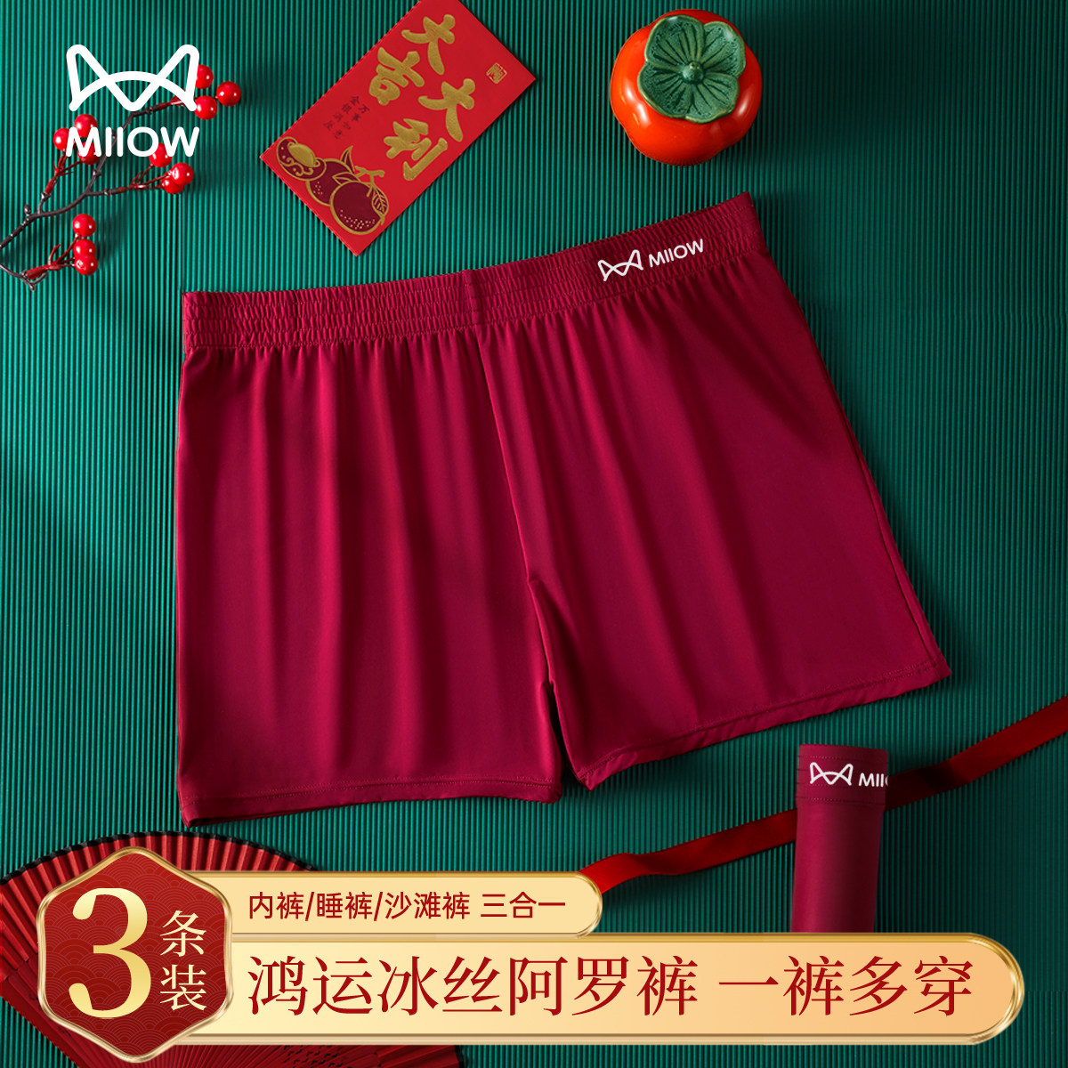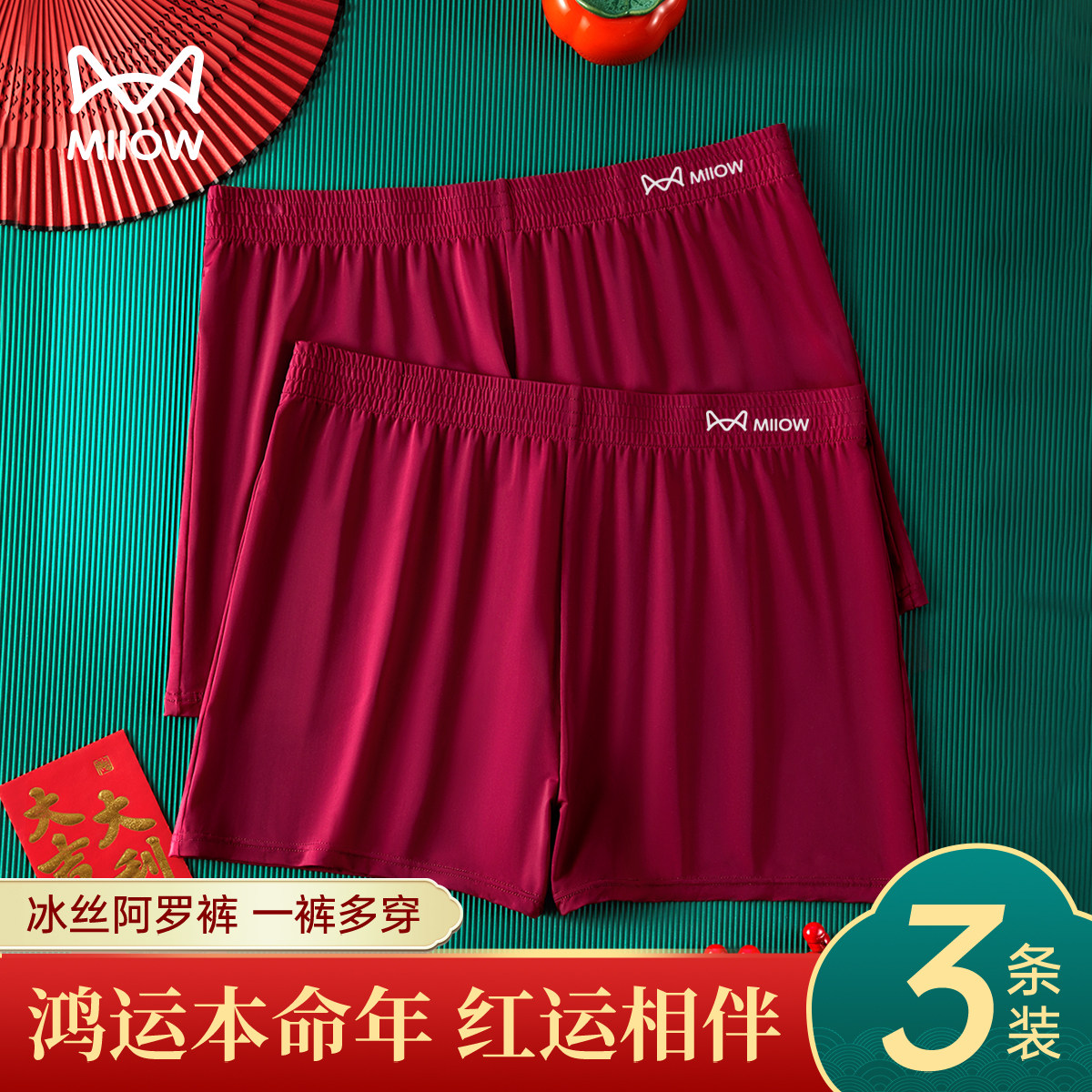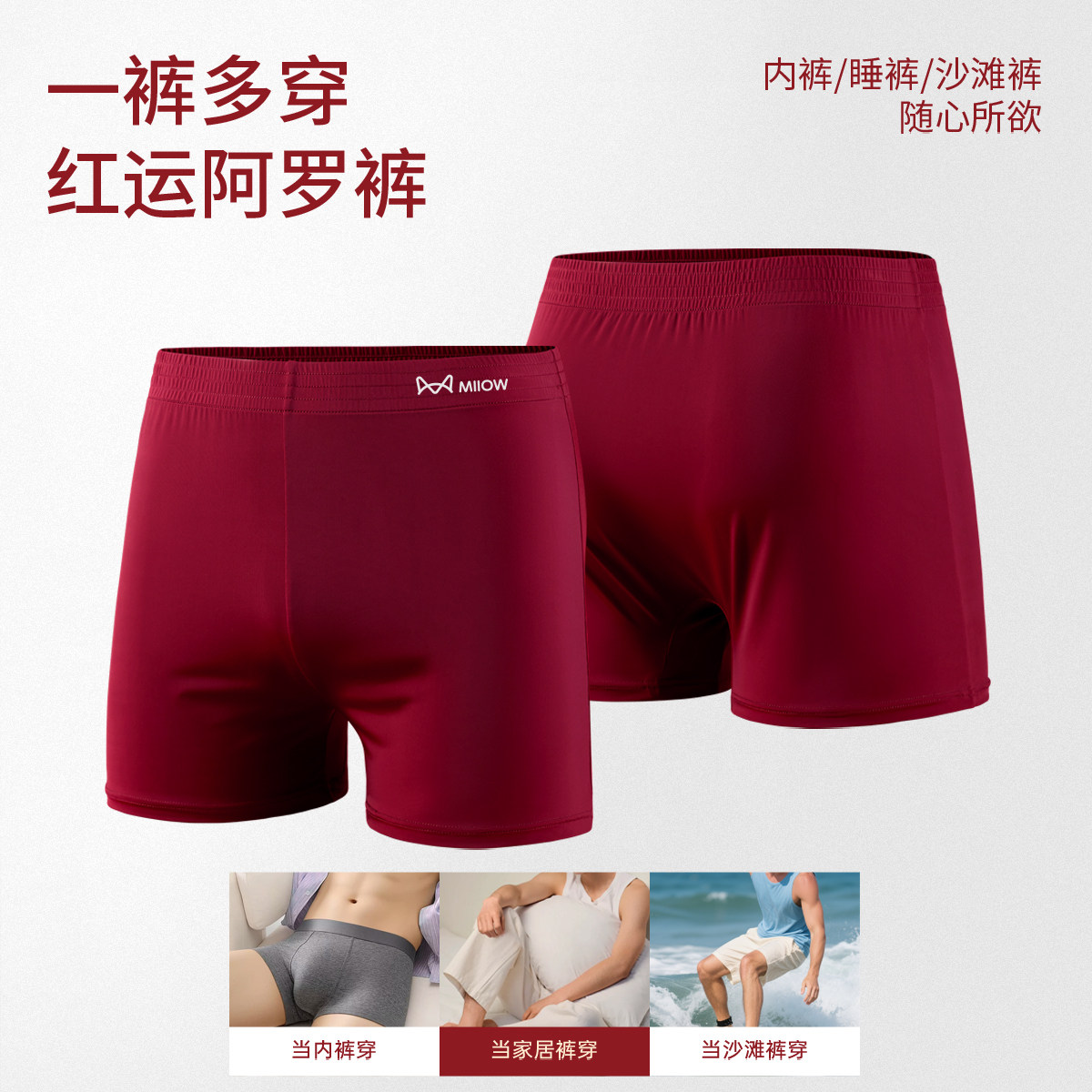 📚 MiiOW/猫人酒红色冰丝男士阿罗裤速干本命年沙滩裤四角平角内裤