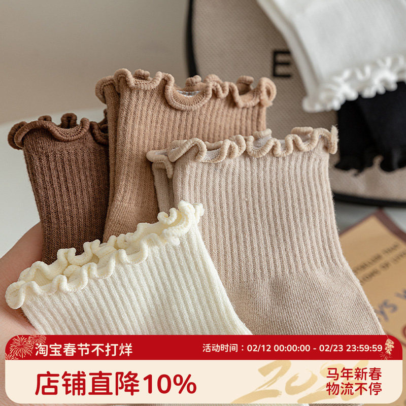 📚 木耳边袜子女中筒袜秋冬季纯棉花边搭配小皮鞋jk乐福鞋黑色月子袜