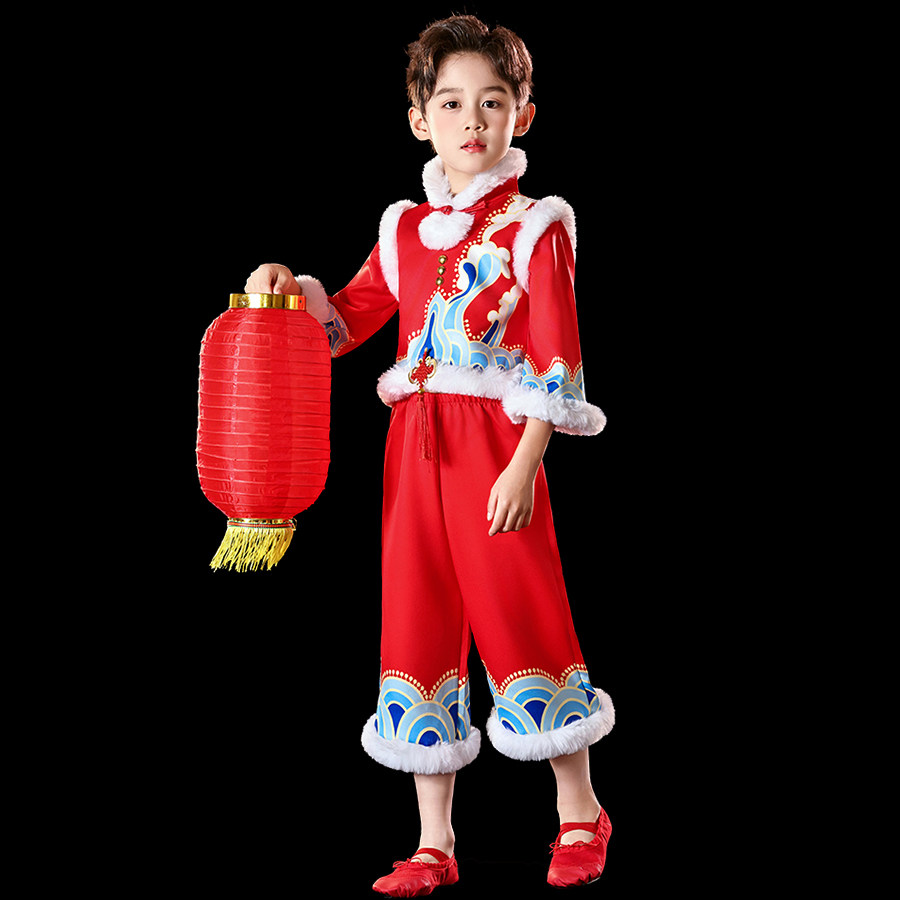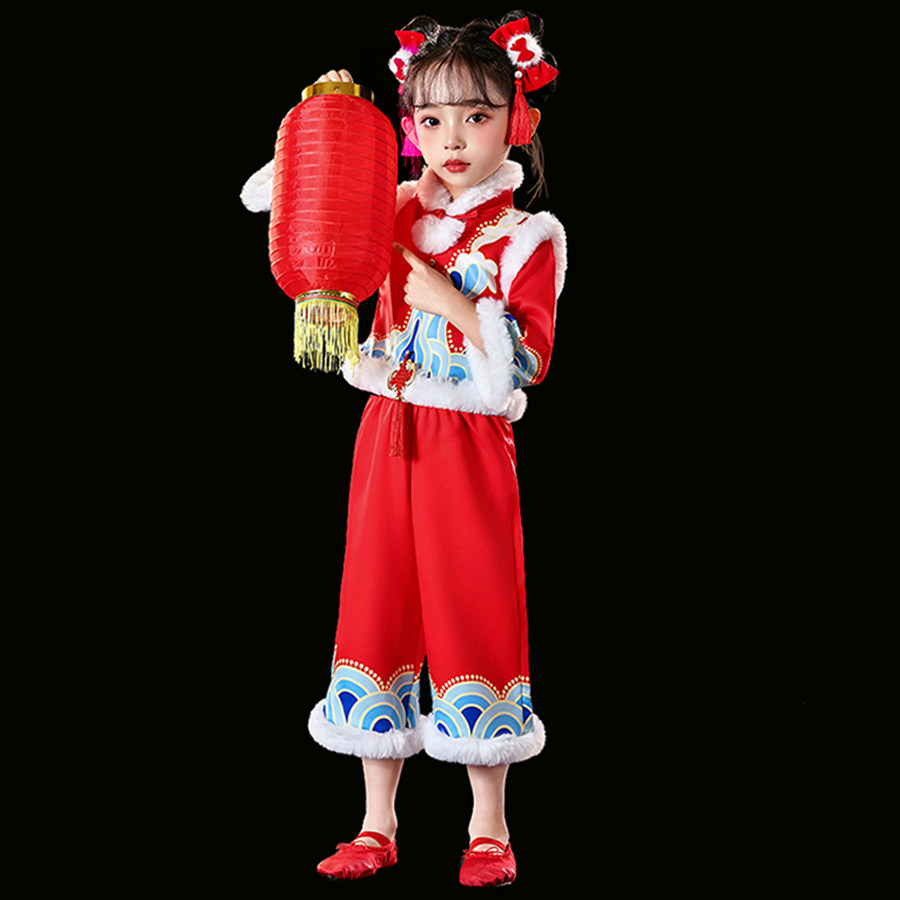 📚 元旦男女童喜庆中国风表演服梦娃舞蹈裙儿童打鼓红灯笼元日演出服