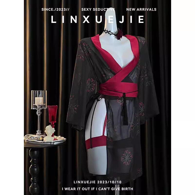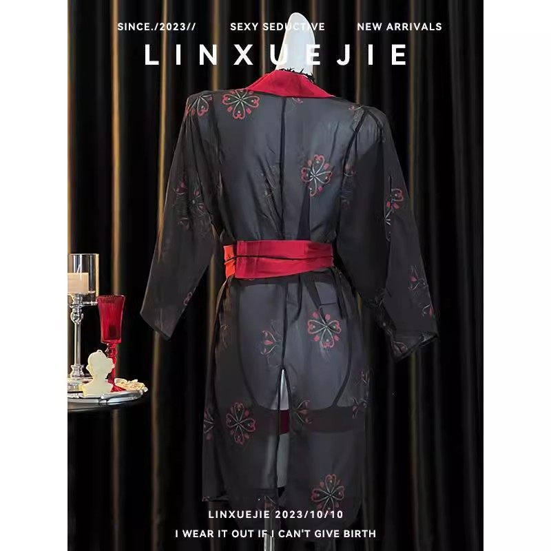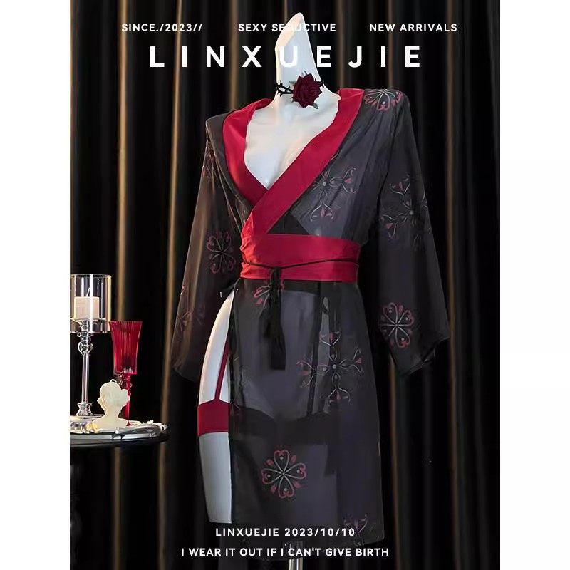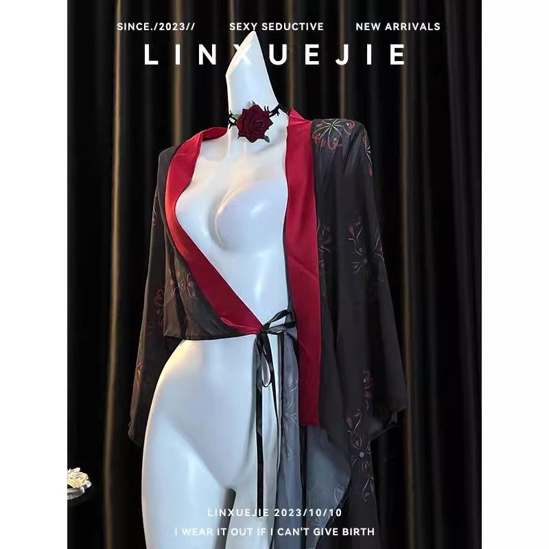 📚 高级感红颜祸水复古风纯欲薄纱透视印花汉服女性感开叉浴袍制服