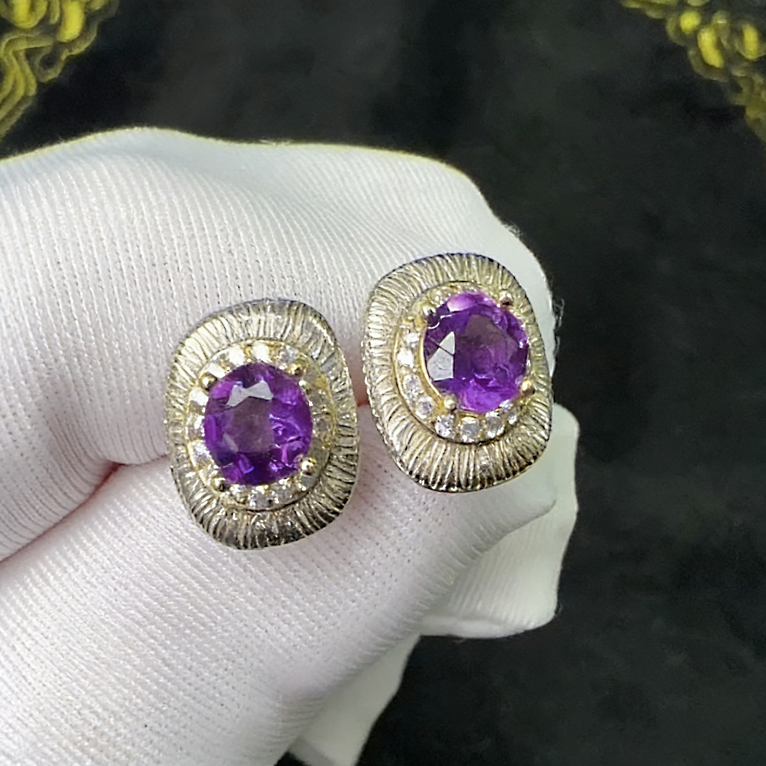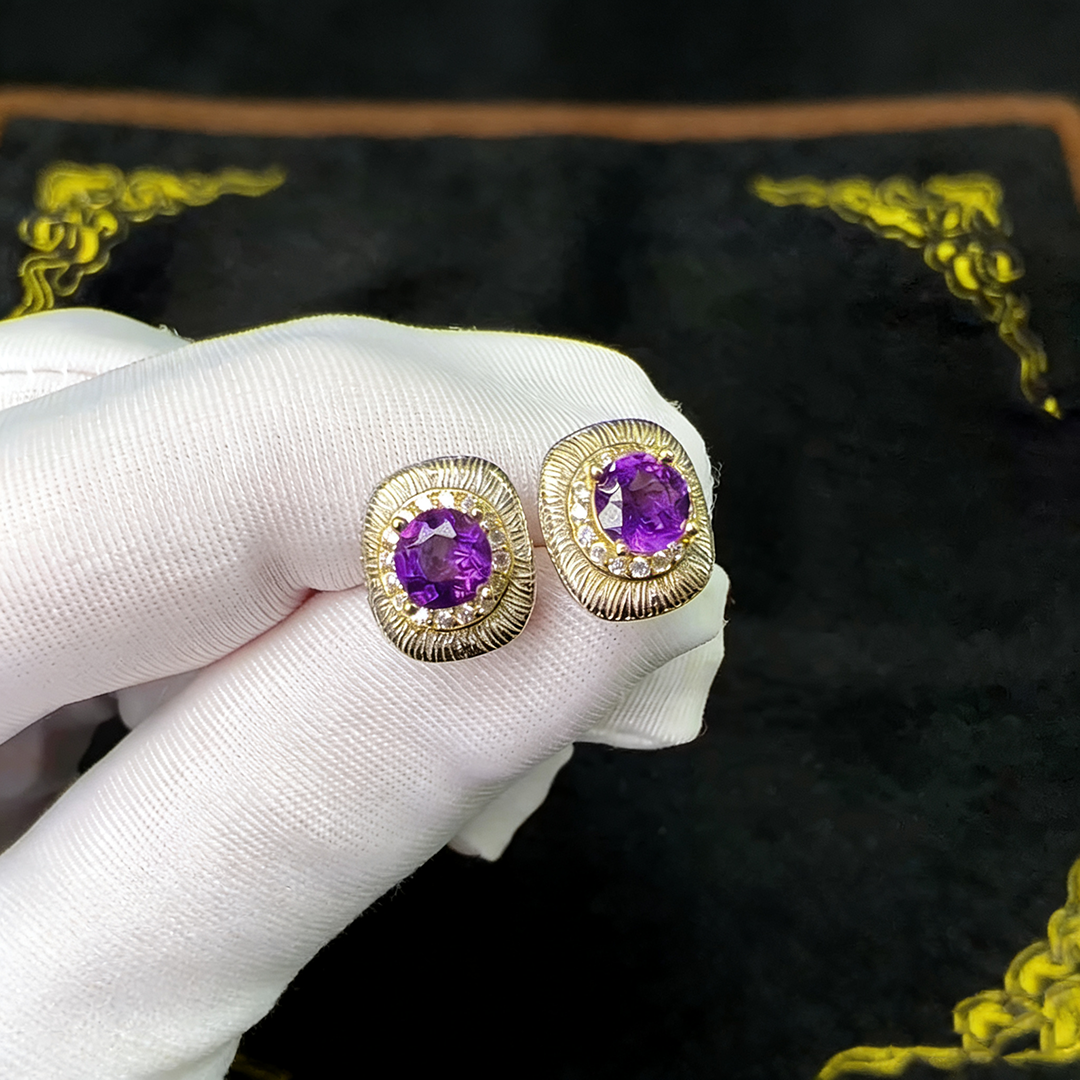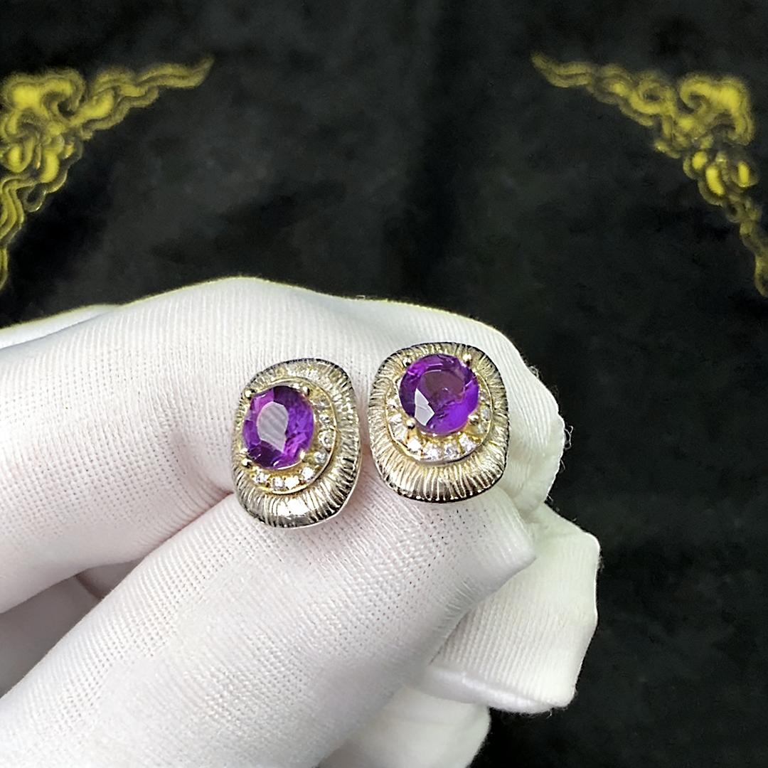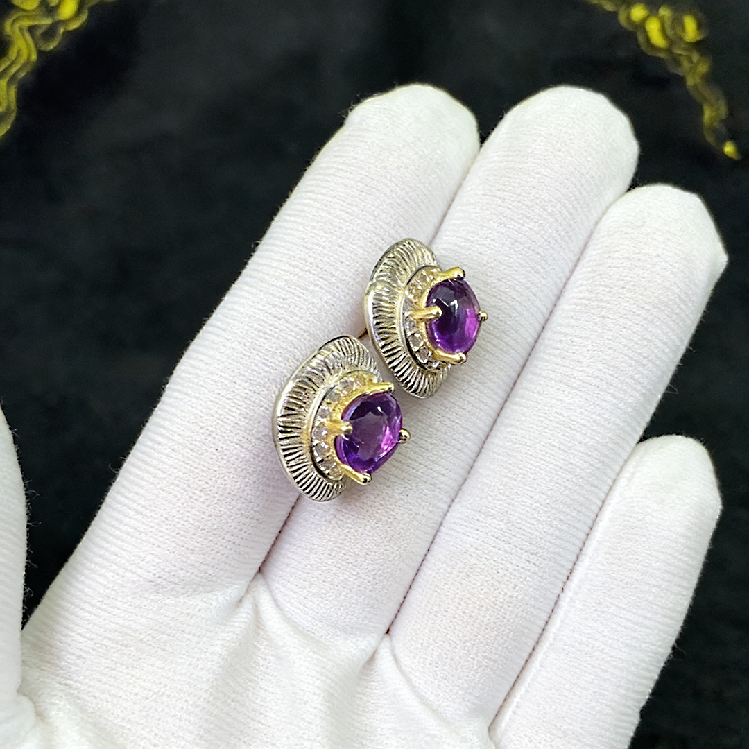 📚 S925银纯银紫水晶耳钉女轻奢设计师款复古高级感方形气质优雅耳饰