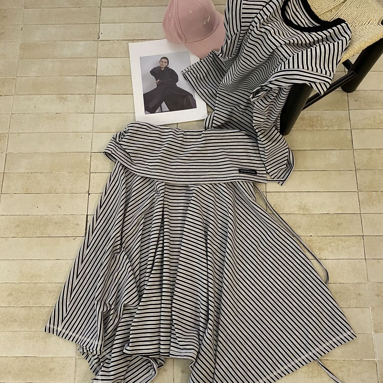 📚 韩系条纹俩件套2026夏款时尚简约休闲显瘦无袖上衣+不规则半身裙