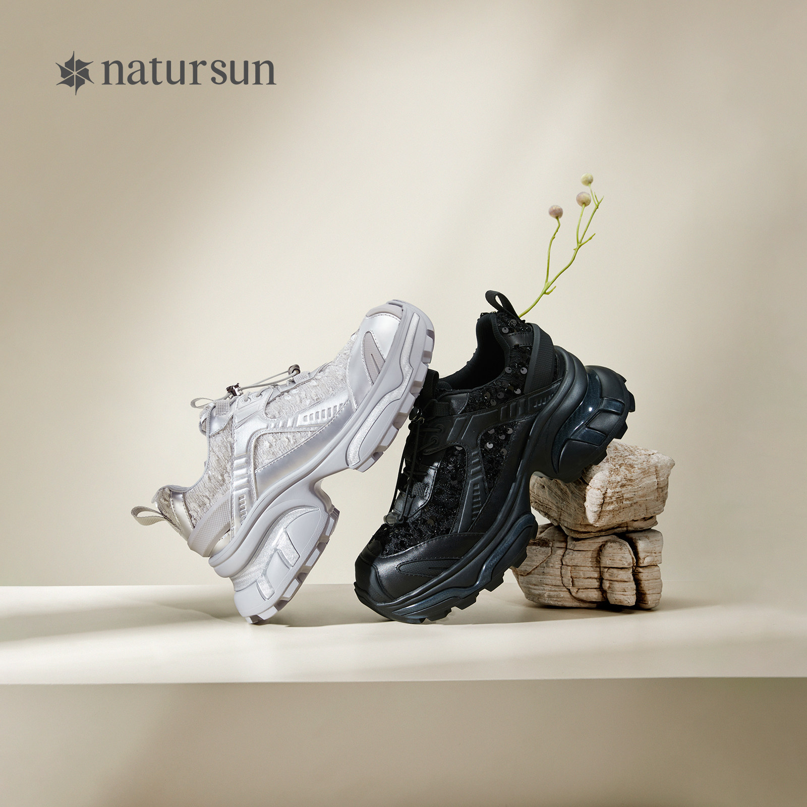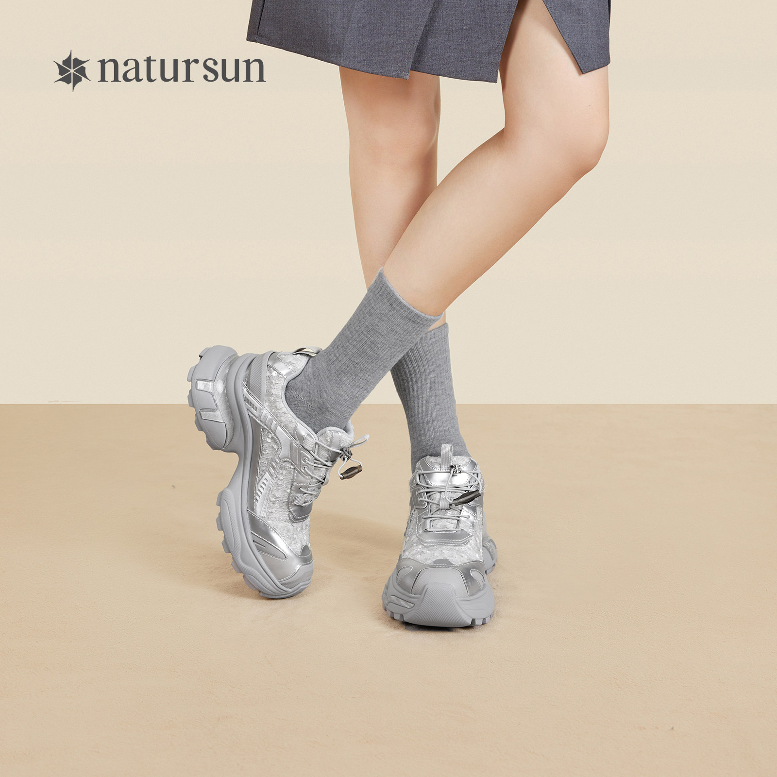 📚 natursun时尚休闲鞋女冬季复古银色老爹鞋系带圆头舒适厚底德训鞋