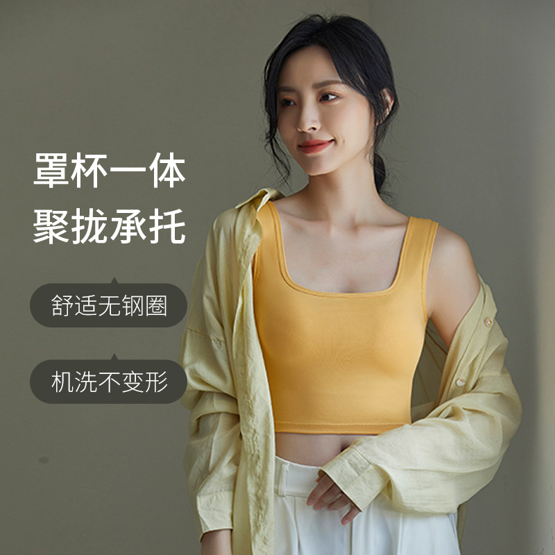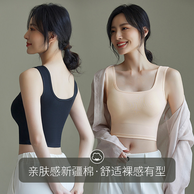 📚 新疆长绒棉女士宽肩方领露脐背心带胸垫免穿文胸纯色吊带内搭外穿