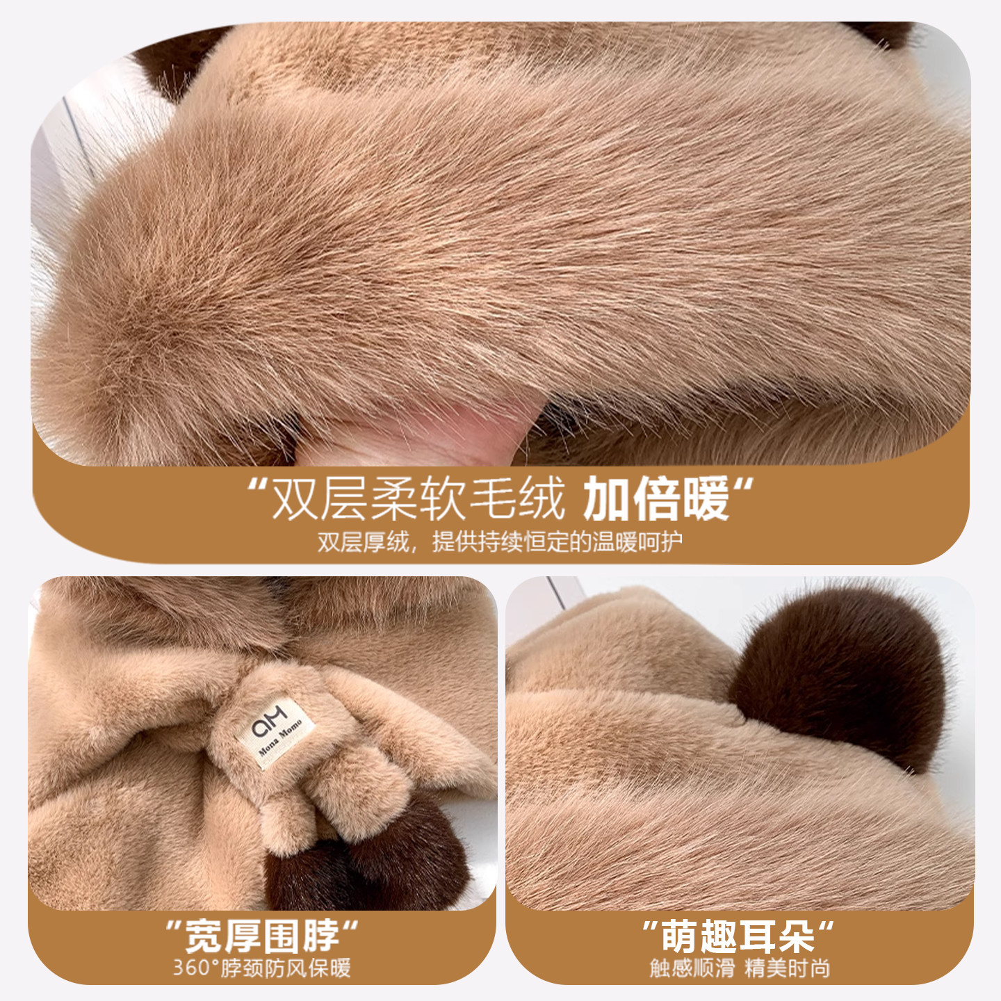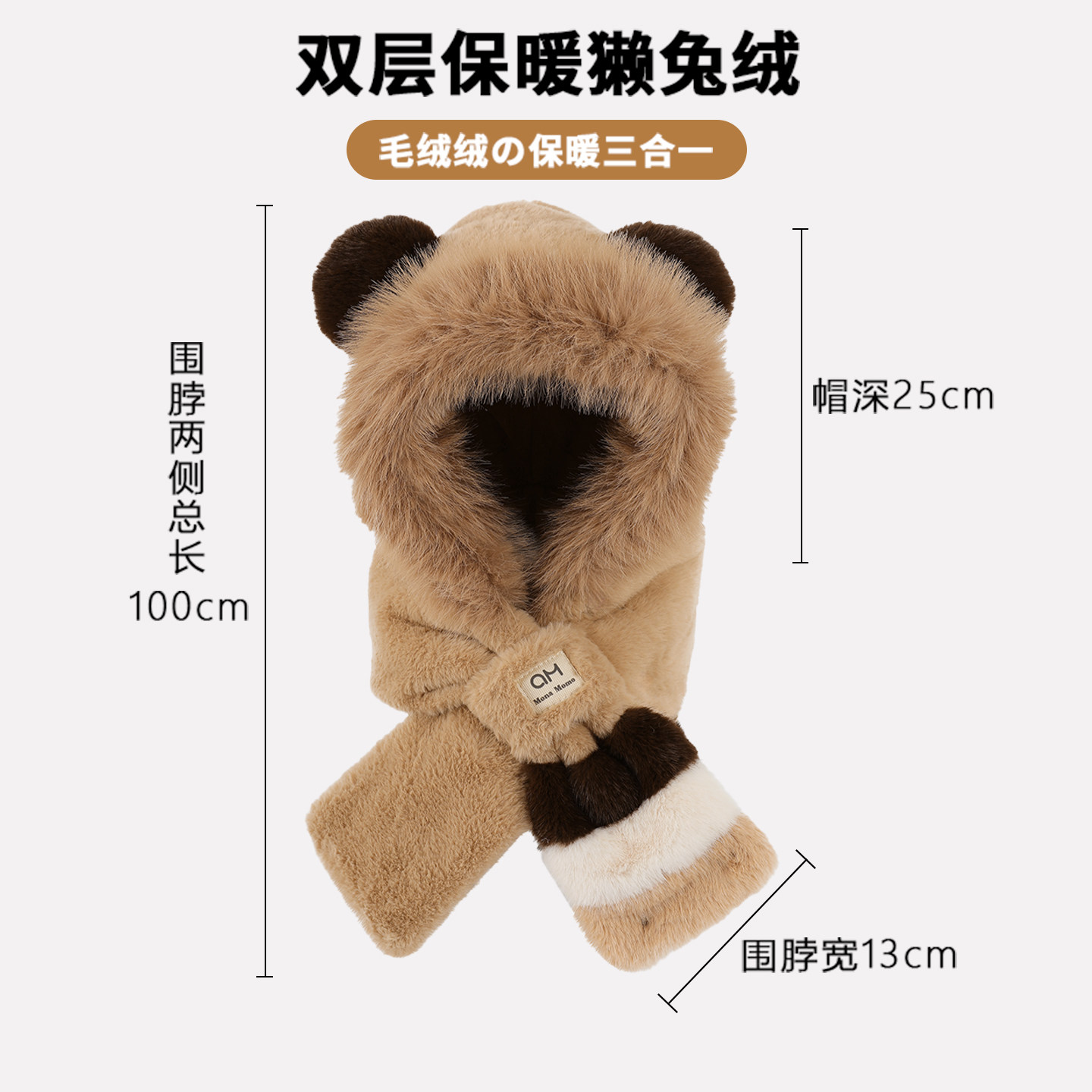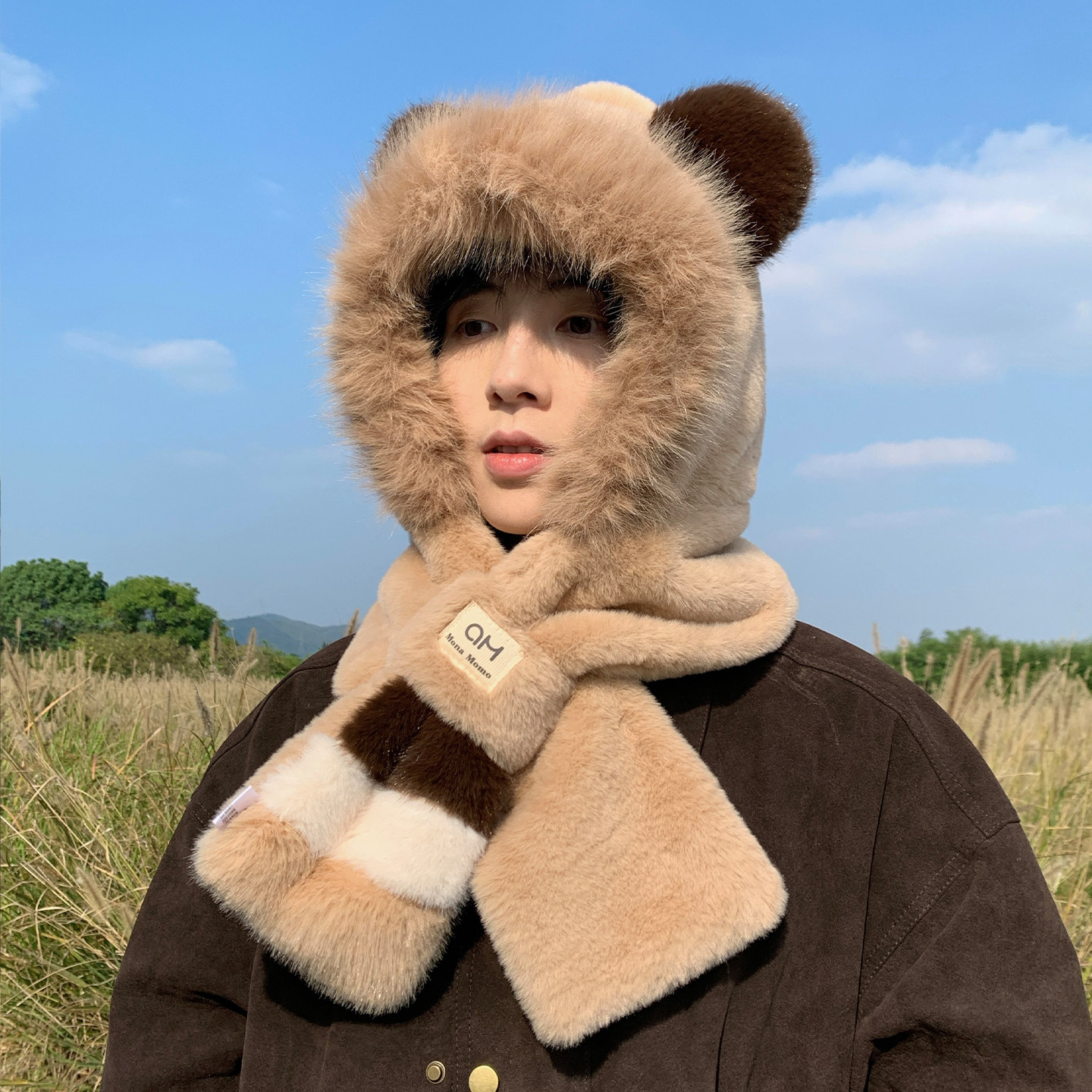 📚 小熊毛绒帽子围巾一体男毛茸茸冬天保暖连帽围脖护耳骑车防寒头套