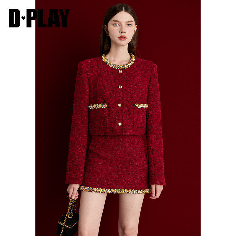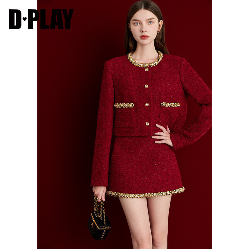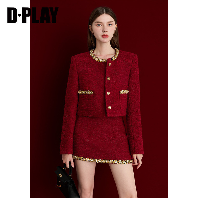 📚 DPLAY【黑标】2025年冬季新款红色粗花呢外套女短款好看闪钻外套