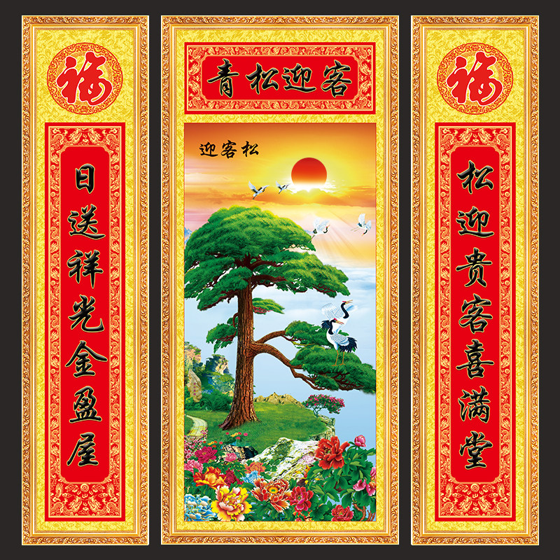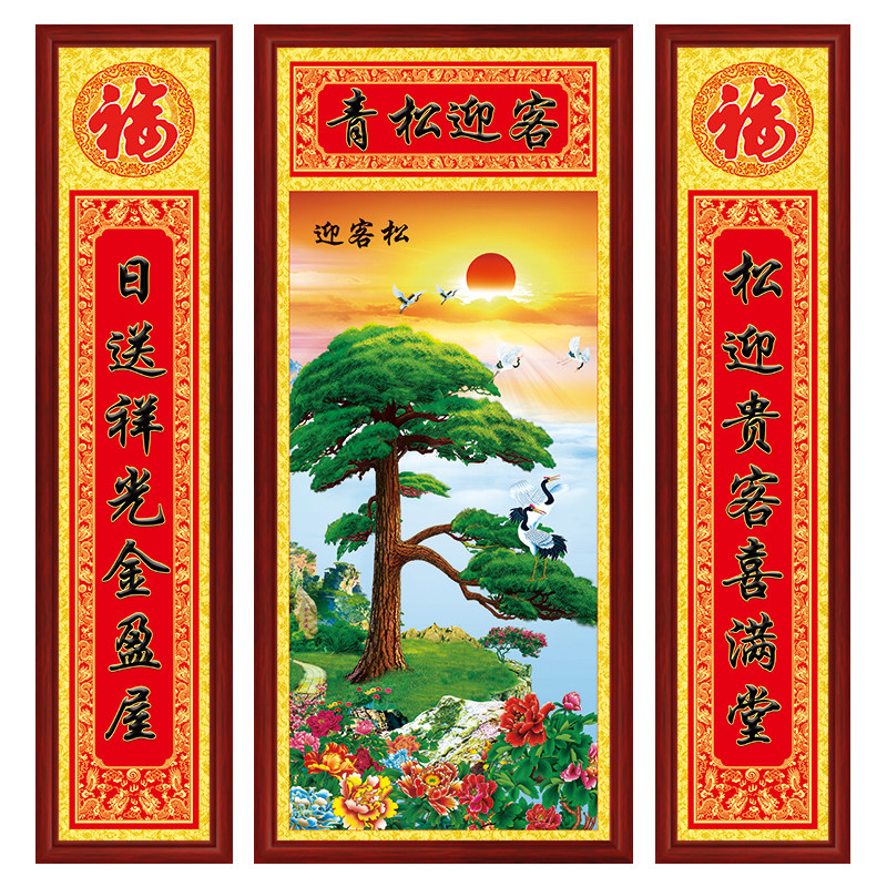 📚 客厅挂画迎客松中堂画农村堂屋大气壁画中式有框带对联山水画字画