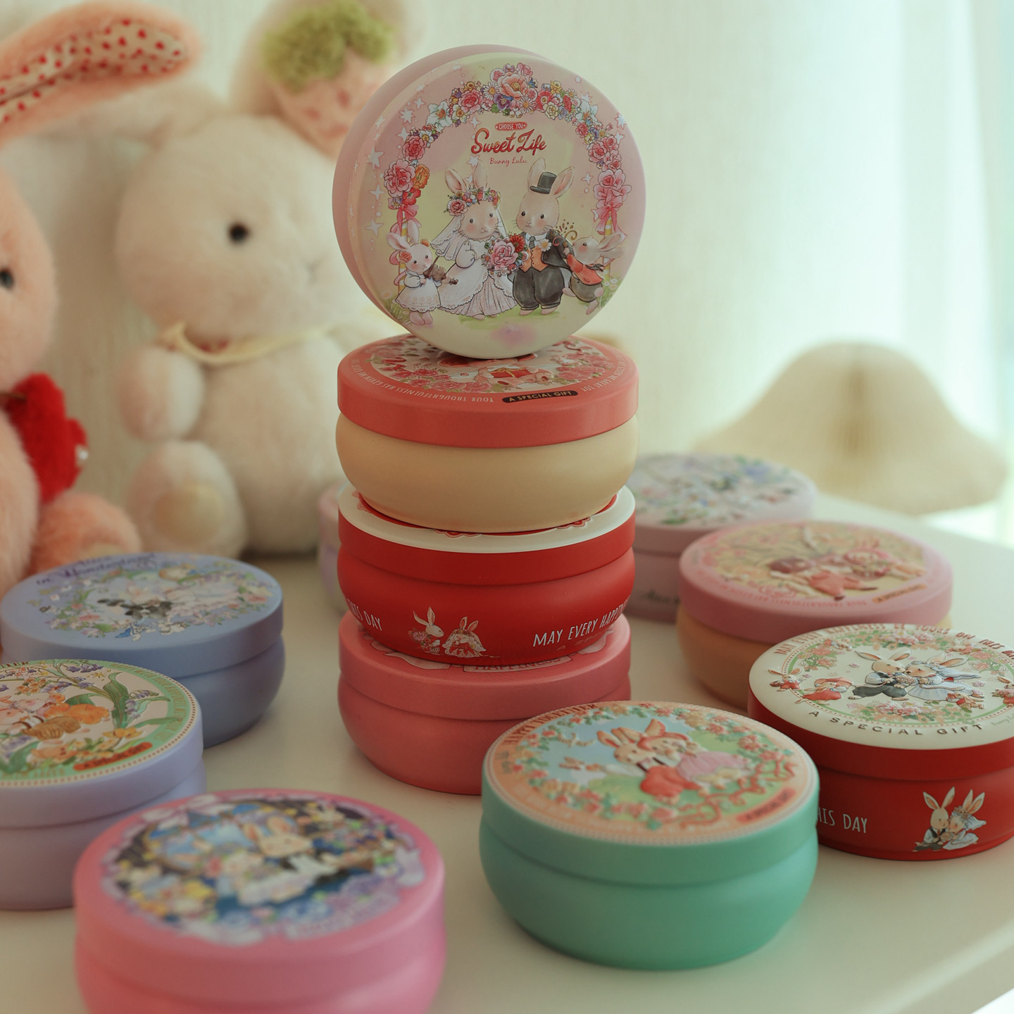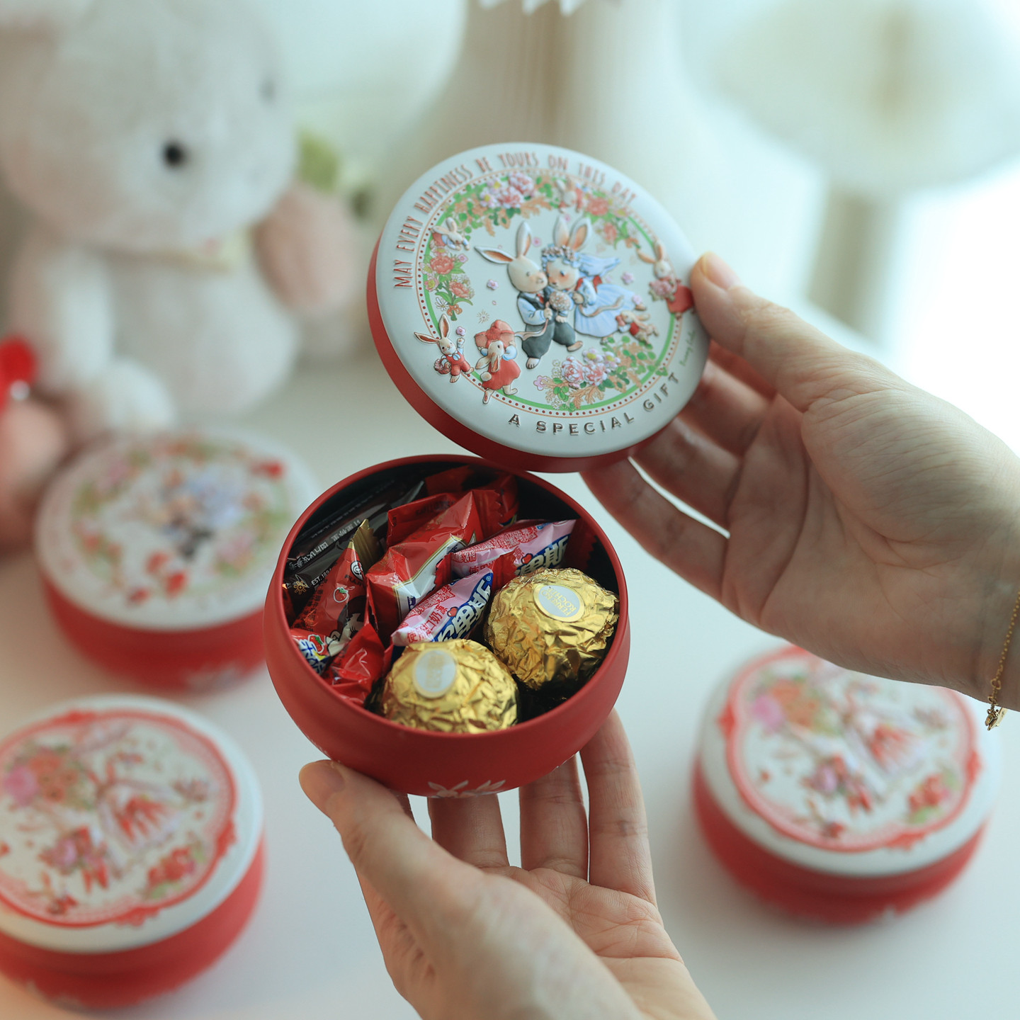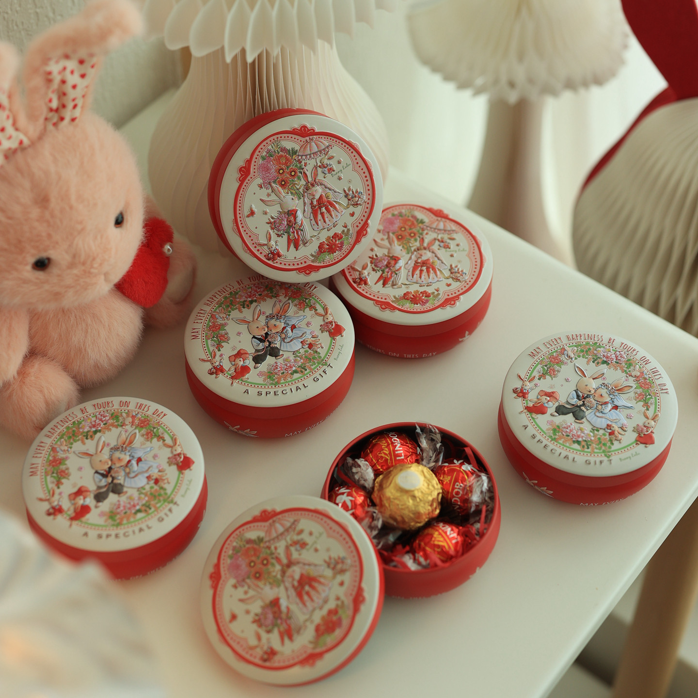 📚 Bunny lulu婚礼红色小兔子新人喜糖盒子马口小铁盒圆形鼓罐糖果盒