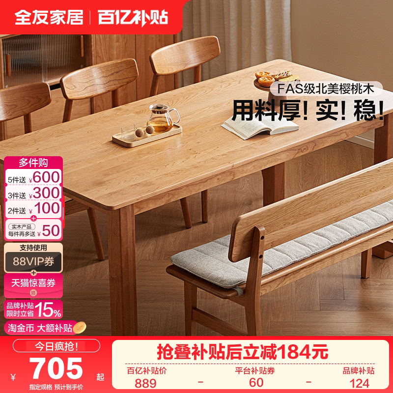 📚 全友家居实木餐桌原木风大尺寸樱桃木饭桌家用简约长方形大板桌