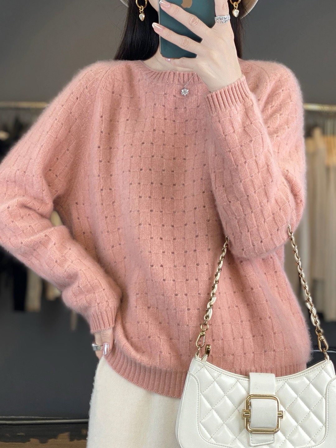 👀接着,看这款毛衣的镂空华夫格设计,简直是一大亮点!穿上身瞬间洋气四溢,显得非常时尚。而且,这款毛衣的针织工艺精湛,手感柔软,穿起来非常舒适。💆♀️