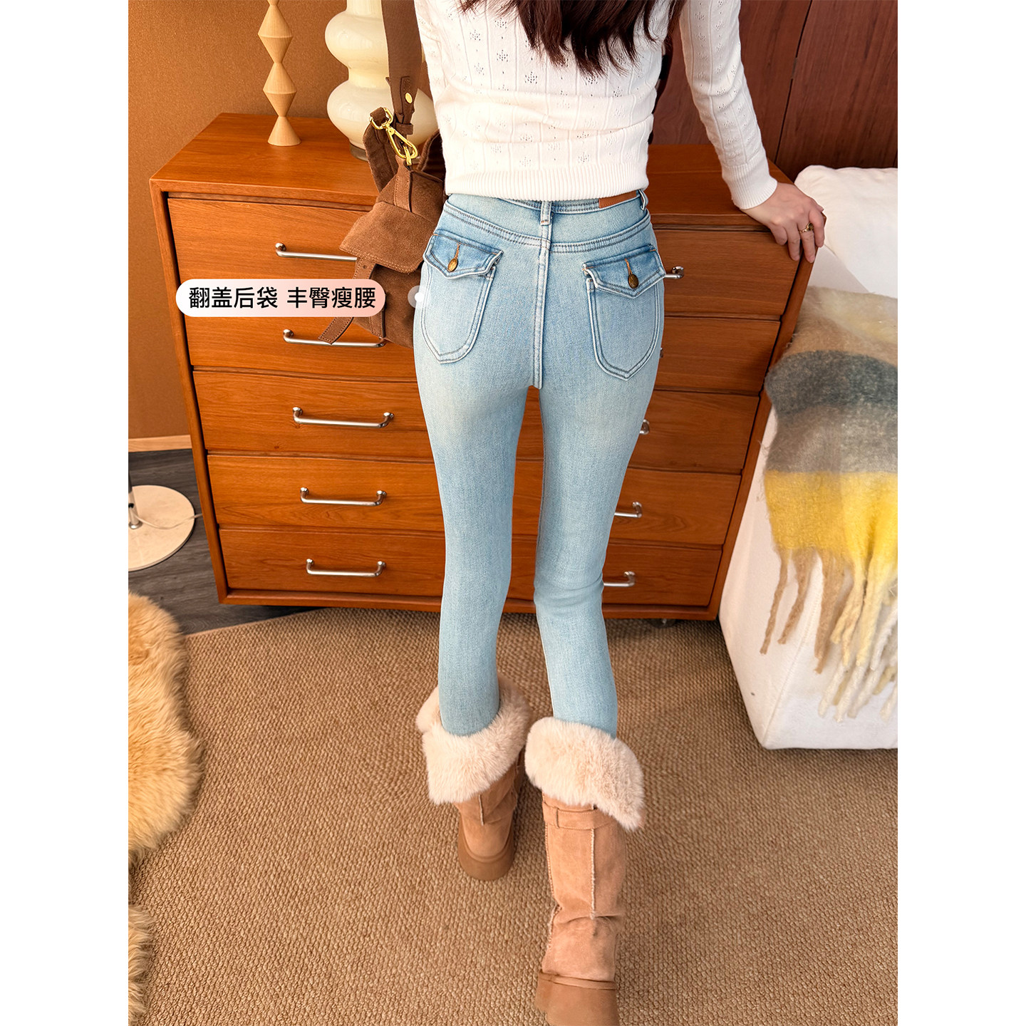📚 一条过冬~加厚绒丰臀牛仔裤女浅蓝色紧身显瘦保暖翻盖小脚靴裤子
