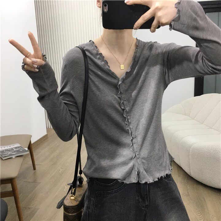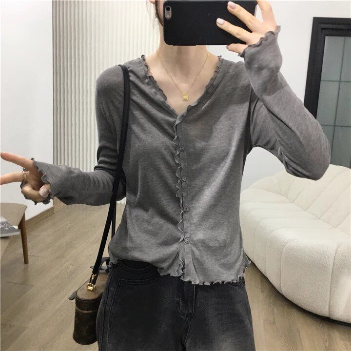 📚 夏天细米定制柔软桑蚕丝莱赛尔木耳边长袖上衣轻薄开衫外套空调衫