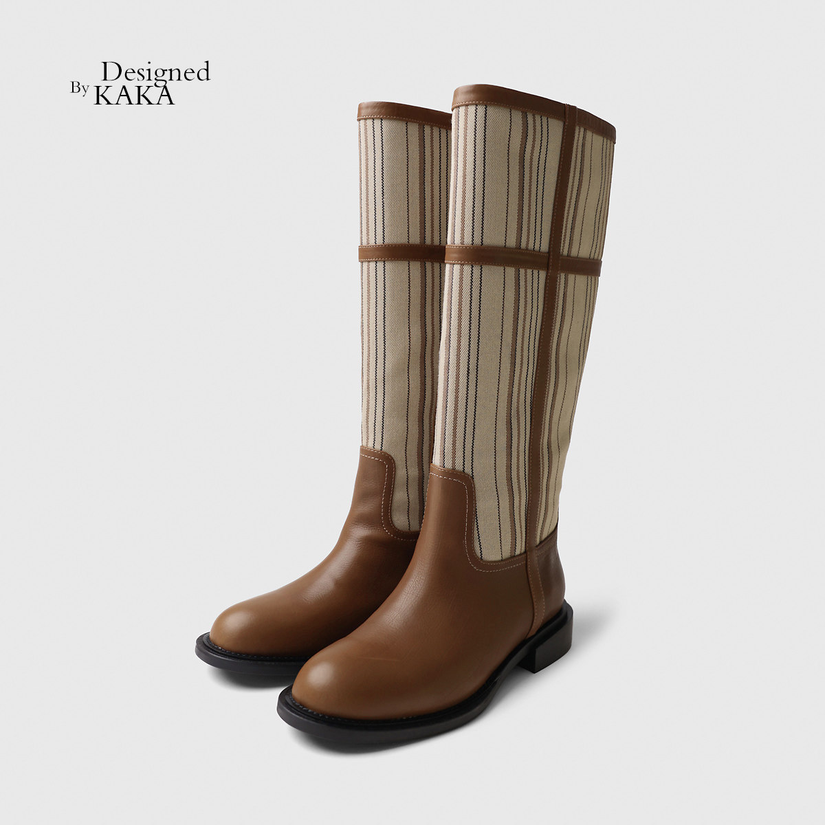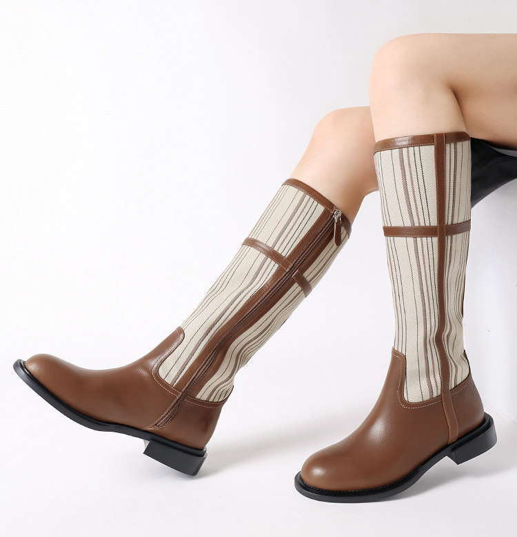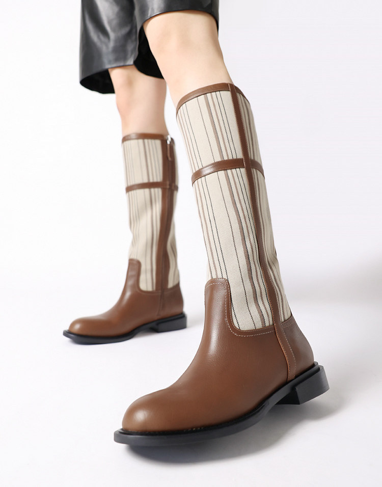 📚 如其所是~伦敦秀款高定条纹面料拼胎牛皮低跟社交名媛百搭长靴特