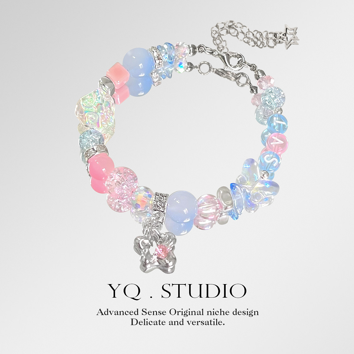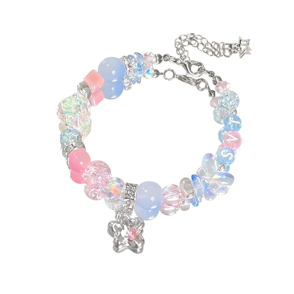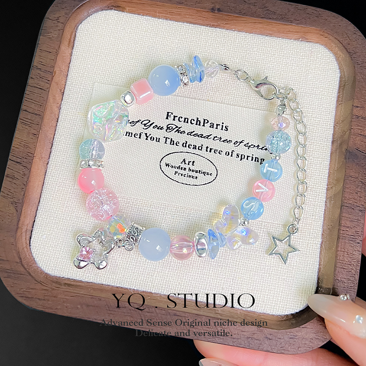 这款手串的颜色是粉蓝色,看起来非常清新可爱。特别的是,它还镶嵌着闪闪发光的Seventeen克拉妹形象,仿佛是少女身边的守护星。每次看到它,都会让人感到心情愉悦,仿佛自己也成为了这个美好的世界中的一部分。