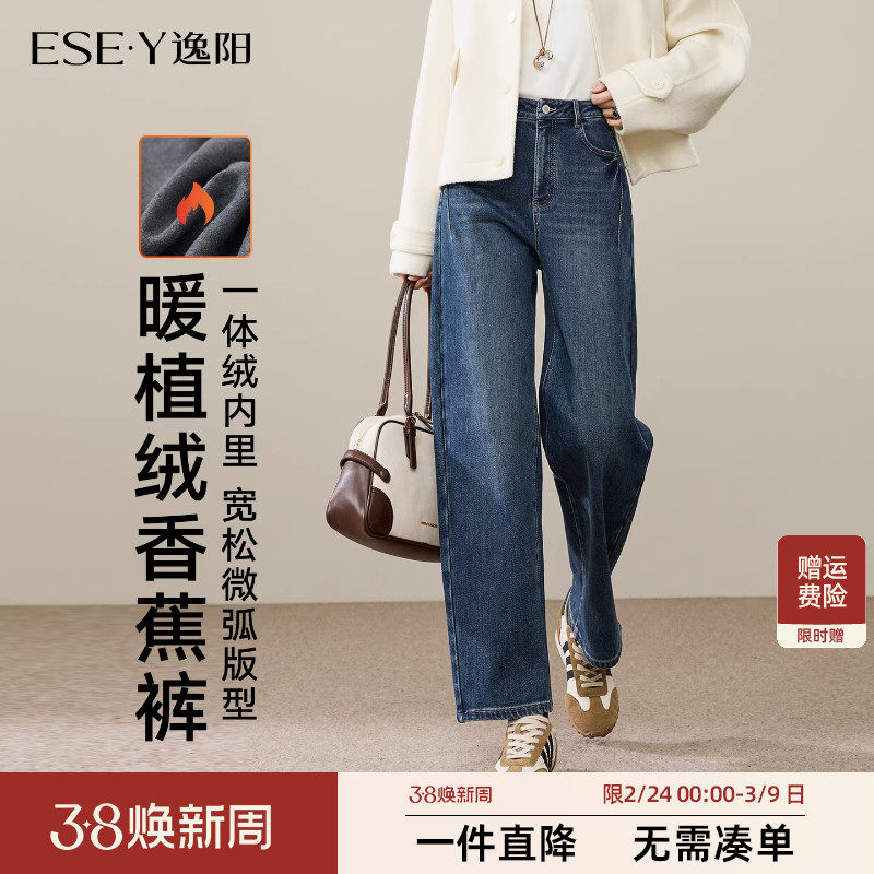 📚 逸阳加绒香蕉牛仔裤秋冬2025新款高腰宽松小个子镰刀哈伦直筒裤子