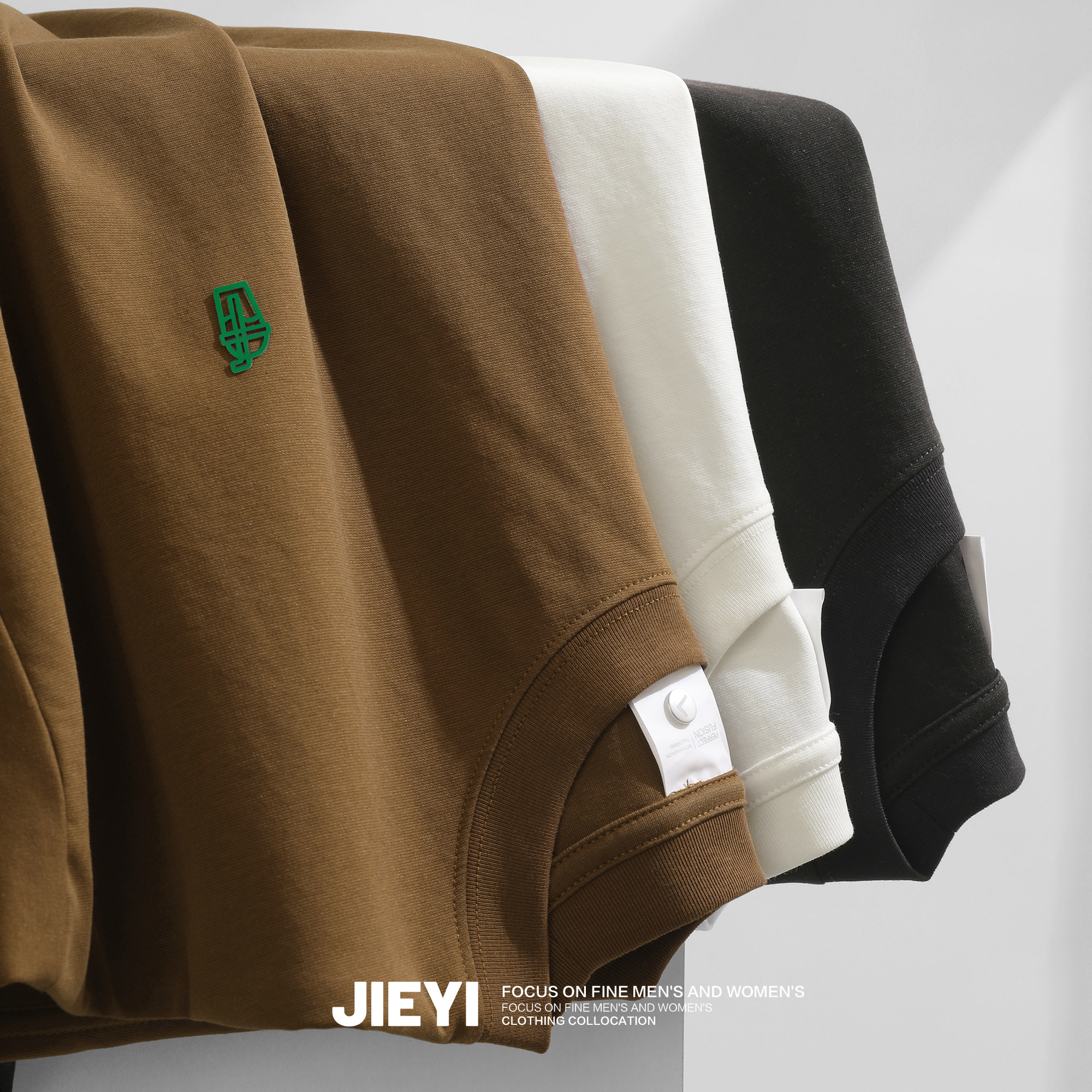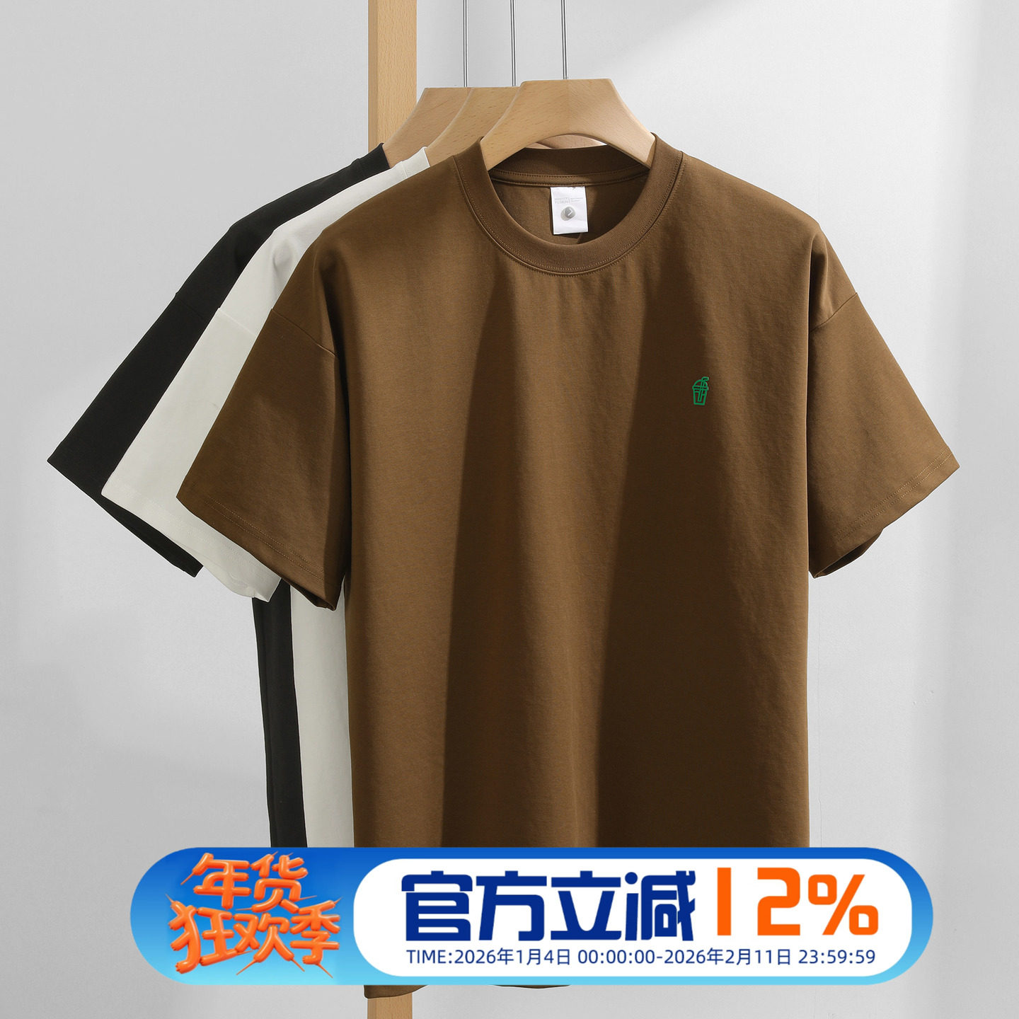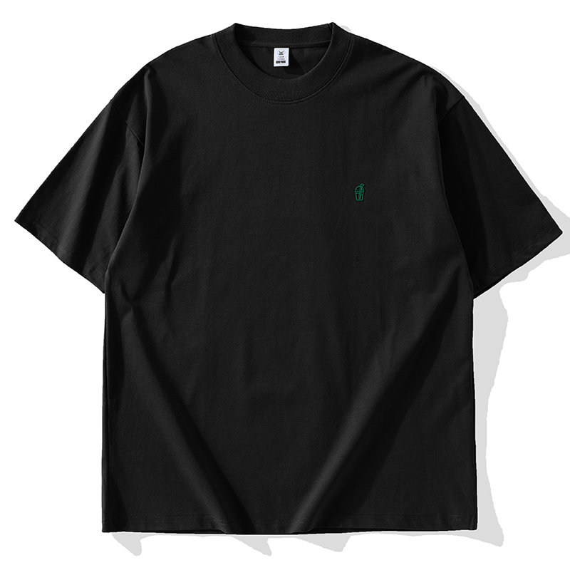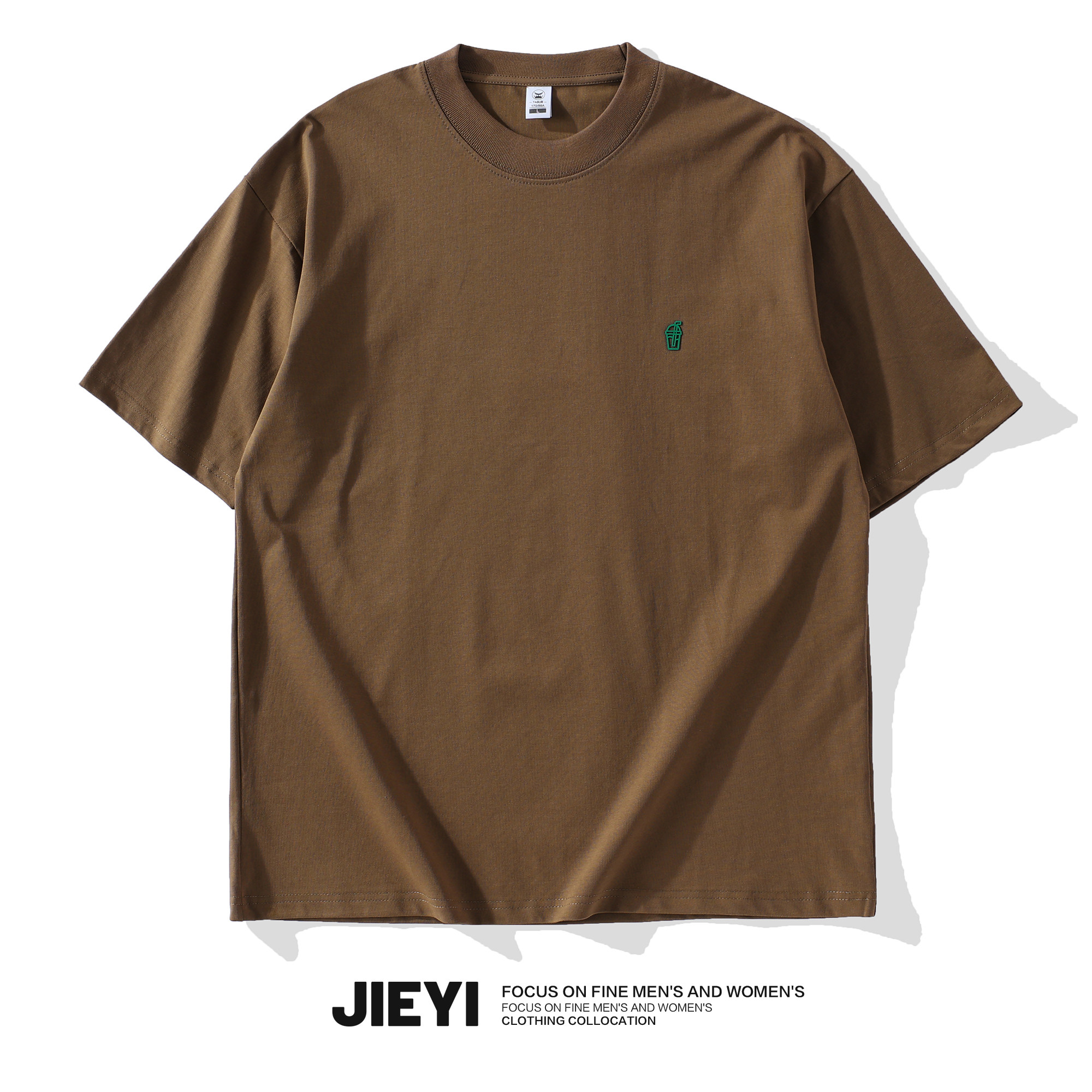 📚 介乙透气双面原棉休闲圆领T恤衫奶茶瓶压胶印花体恤夏日男生上衣
