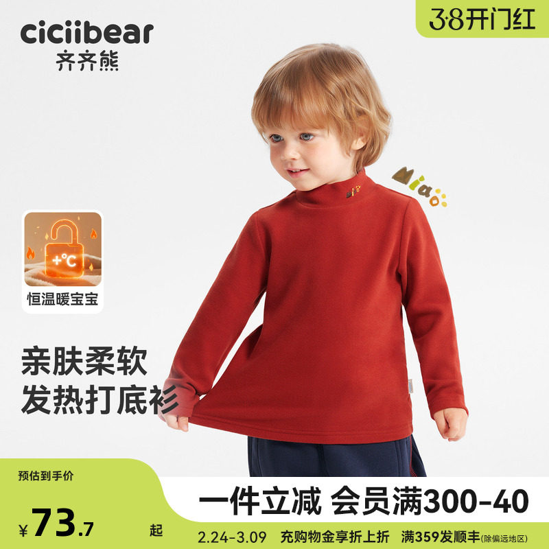📚 [发热]齐齐熊宝宝打底衫红色冬男童T恤长袖保暖上衣儿童新年高领