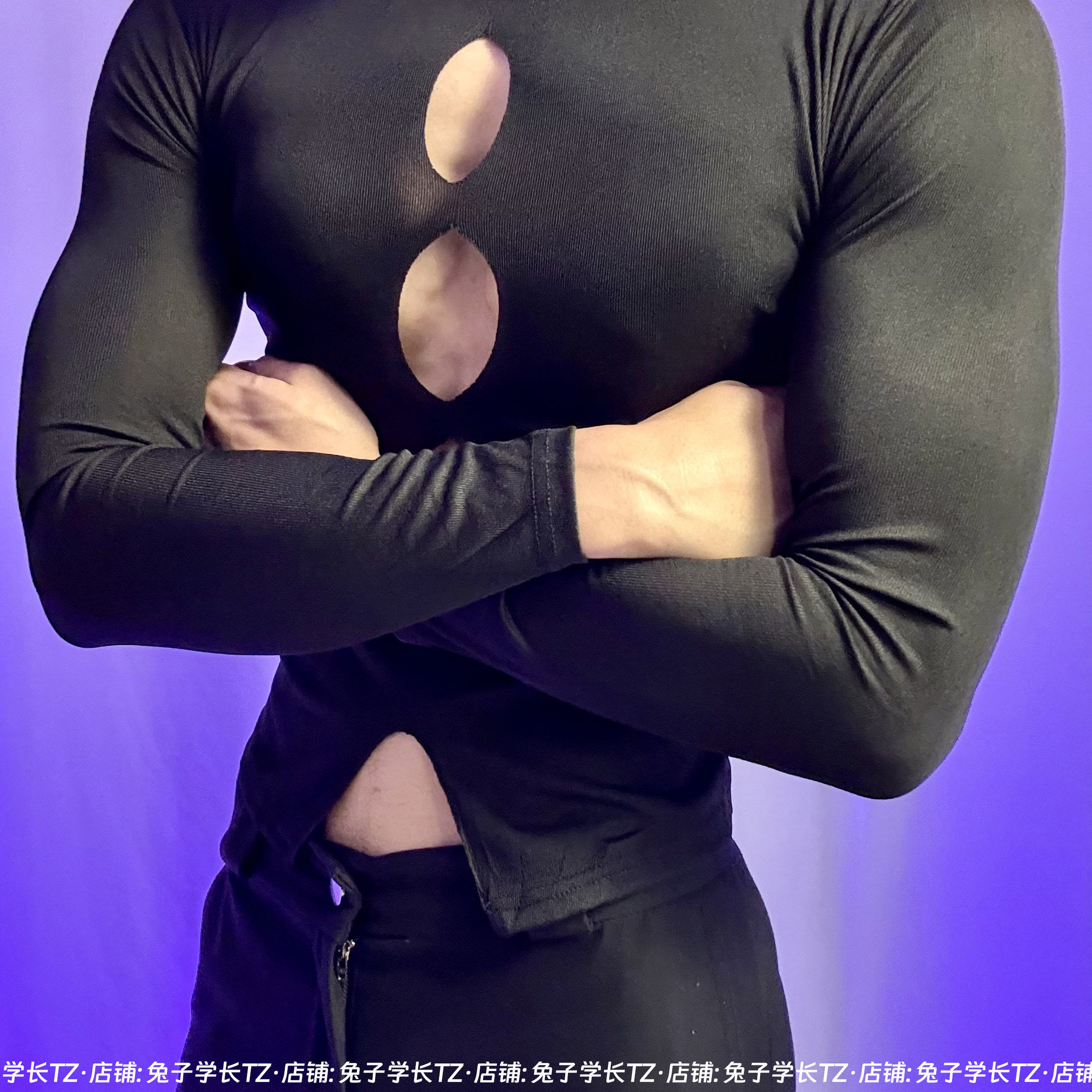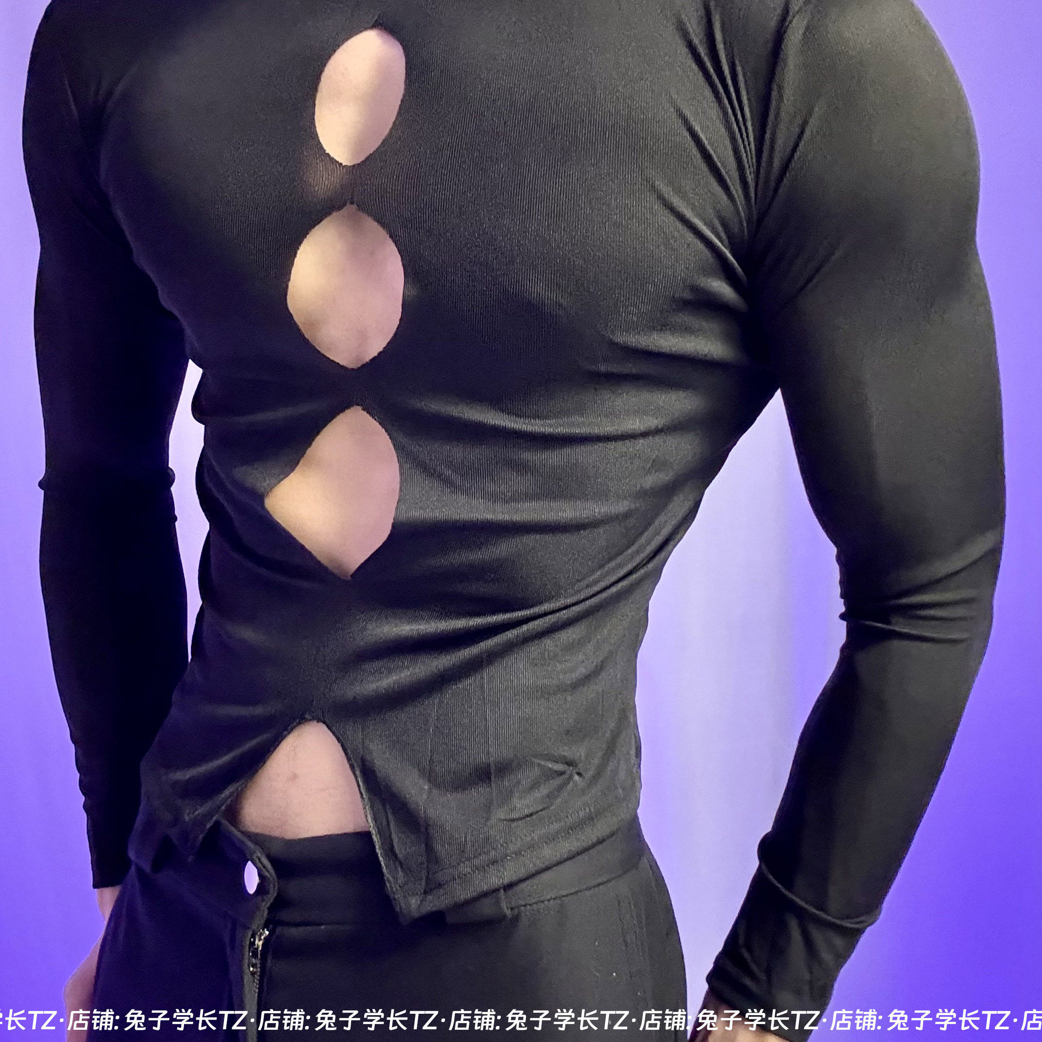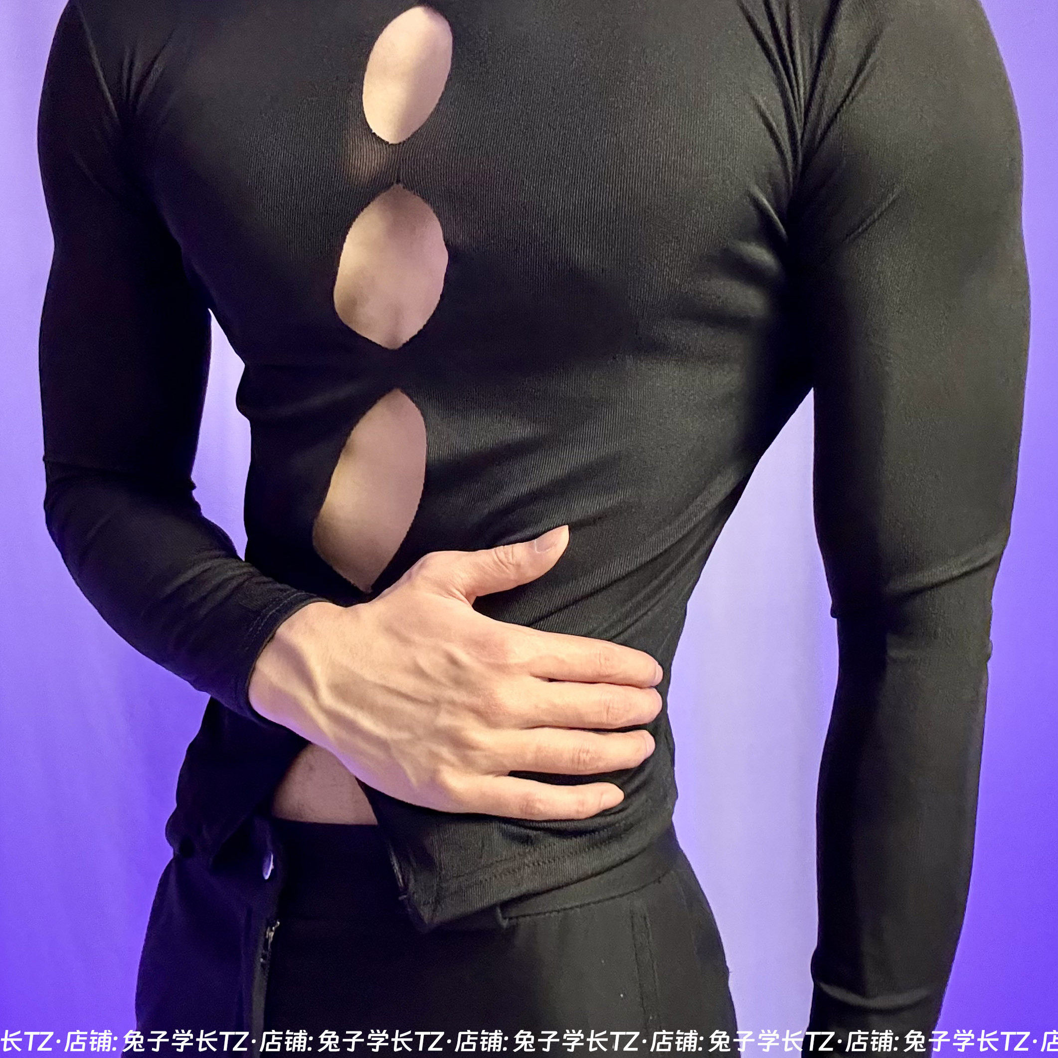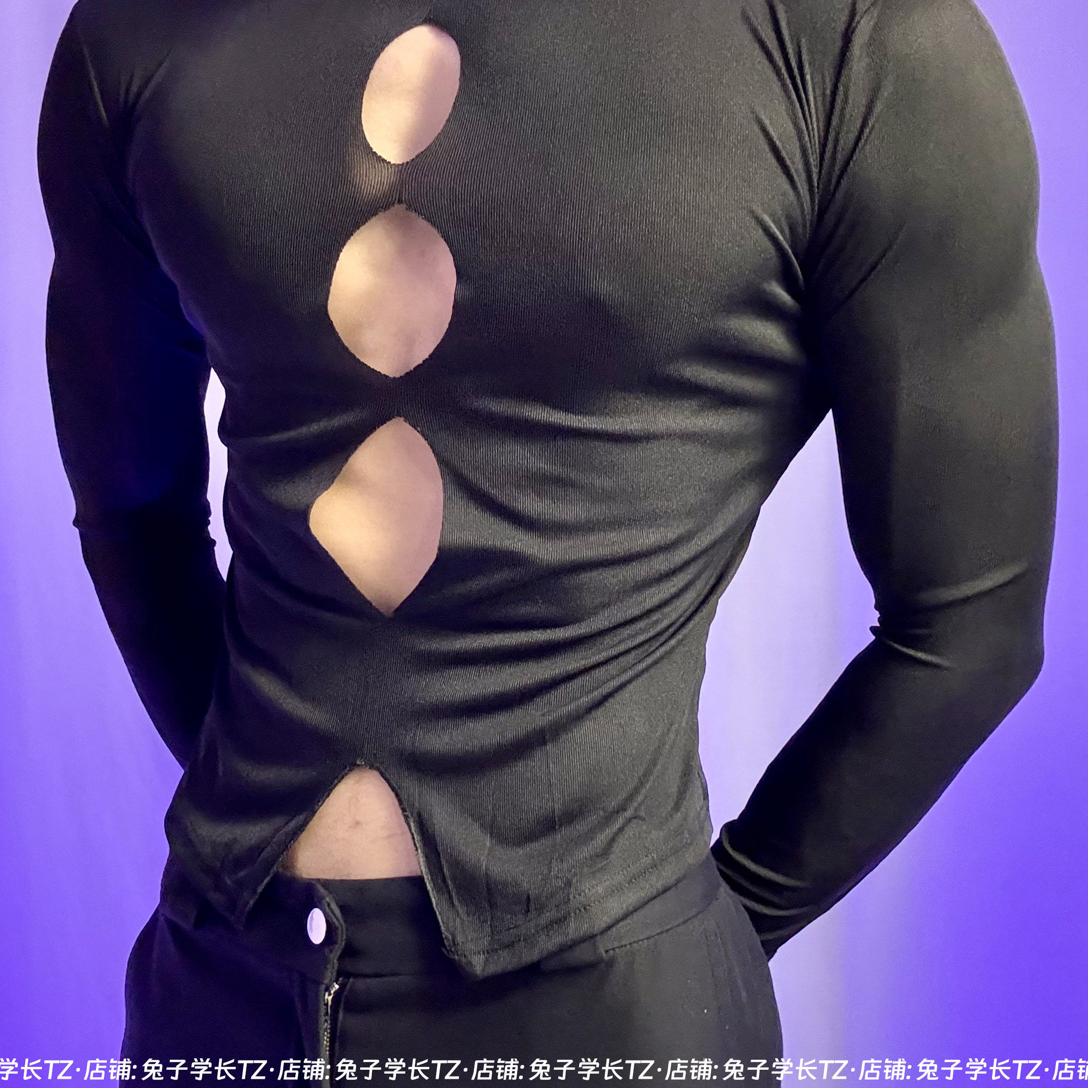 📚 美式辣弟 圆领镂空纯欲性感打底衫男生模特秋冬季长袖修身t恤上衣