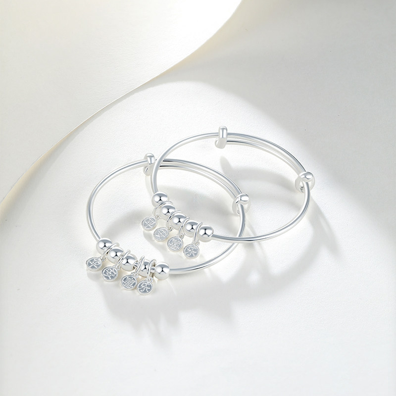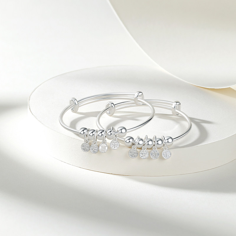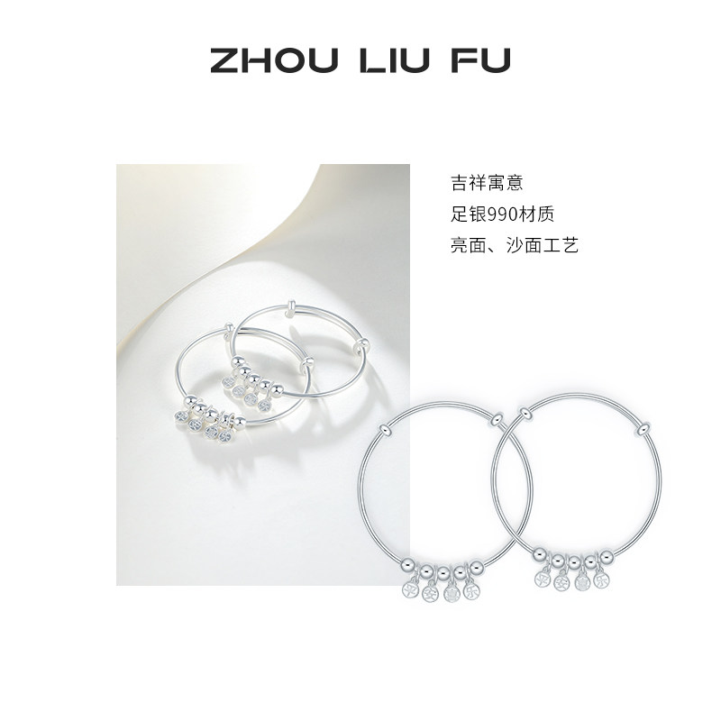 📚 周六福银手镯女S990足银平安喜乐字符银镯宝宝款银饰礼物