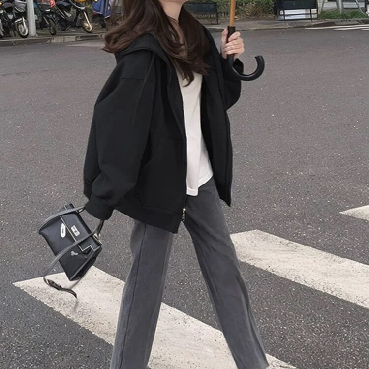 📚 开衫百搭基础款黑色拉链外套卫衣女连帽2026春秋薄款韩系连帽上衣