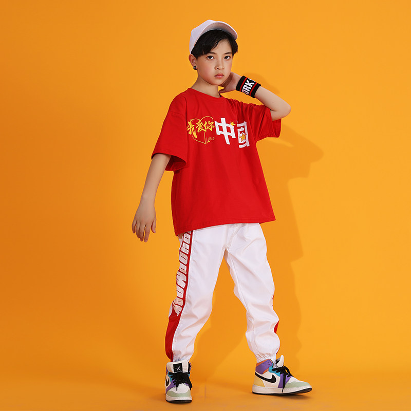#国潮儿童运动套装 #红色男童 #嘻哈街舞风格 #演出服 #露脐短袖 #券后价39