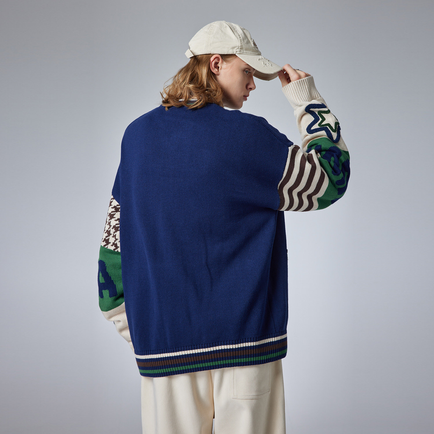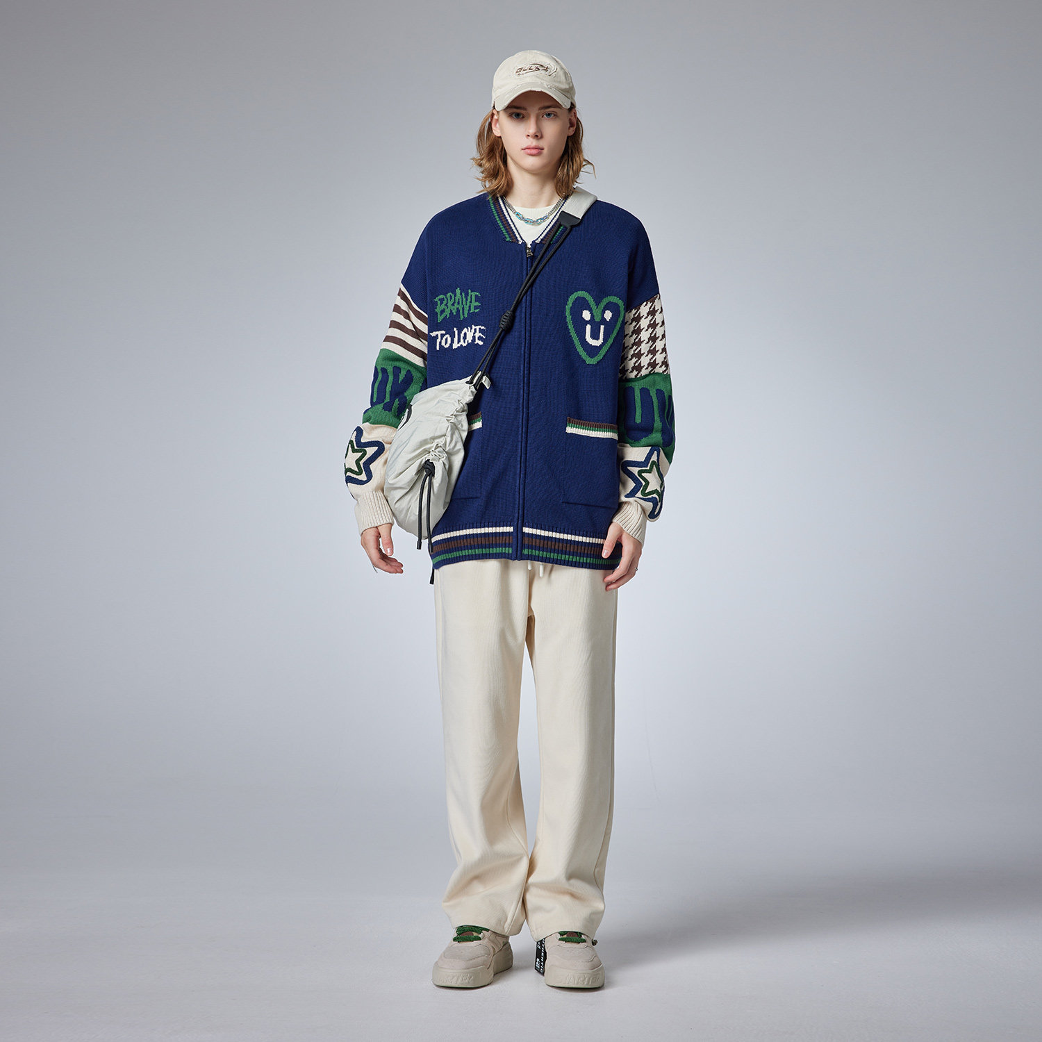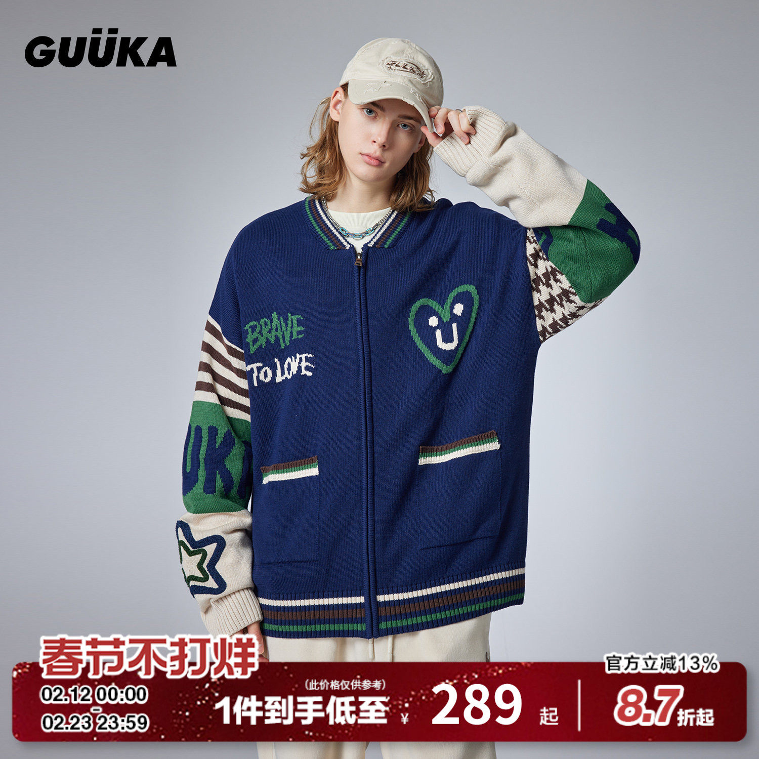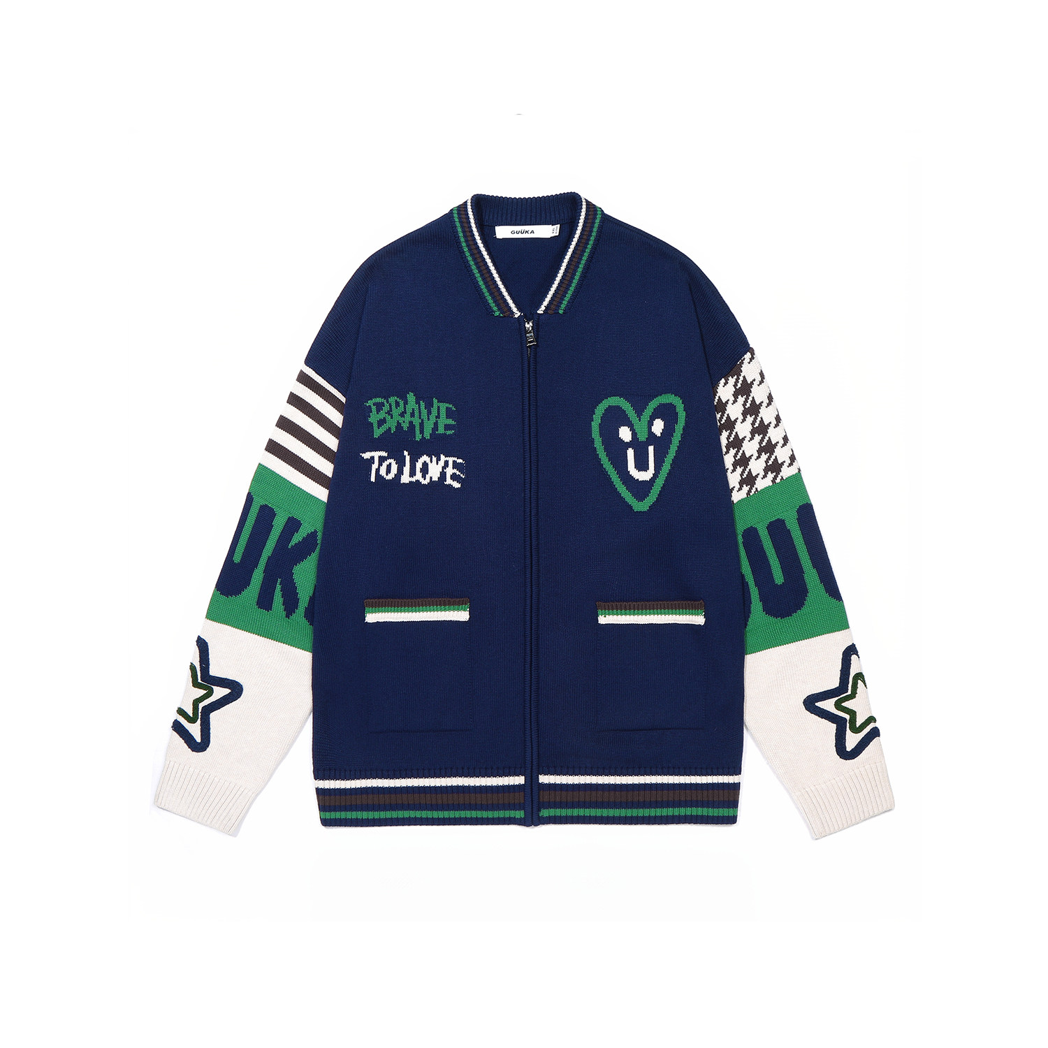 📚 全伊伦同款GUUKA潮牌拼色开衫男针织衫加厚 爱心提花毛衣外套宽松