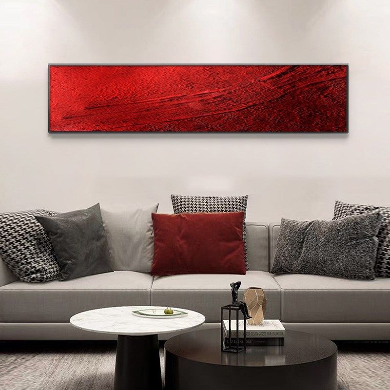 📚 红色横版纯手绘油画客厅装饰画抽象极简卧室床头挂画细长条肌理画
