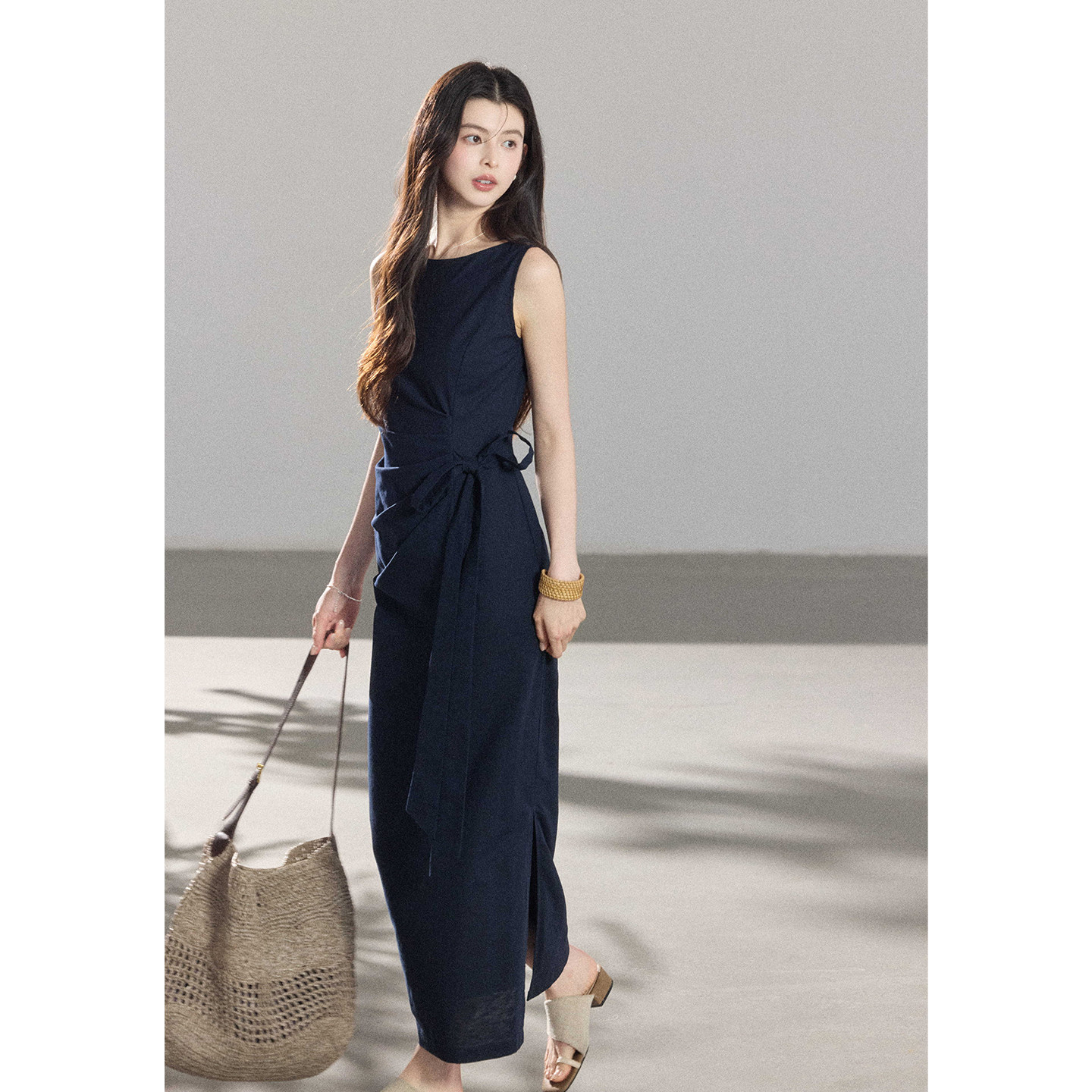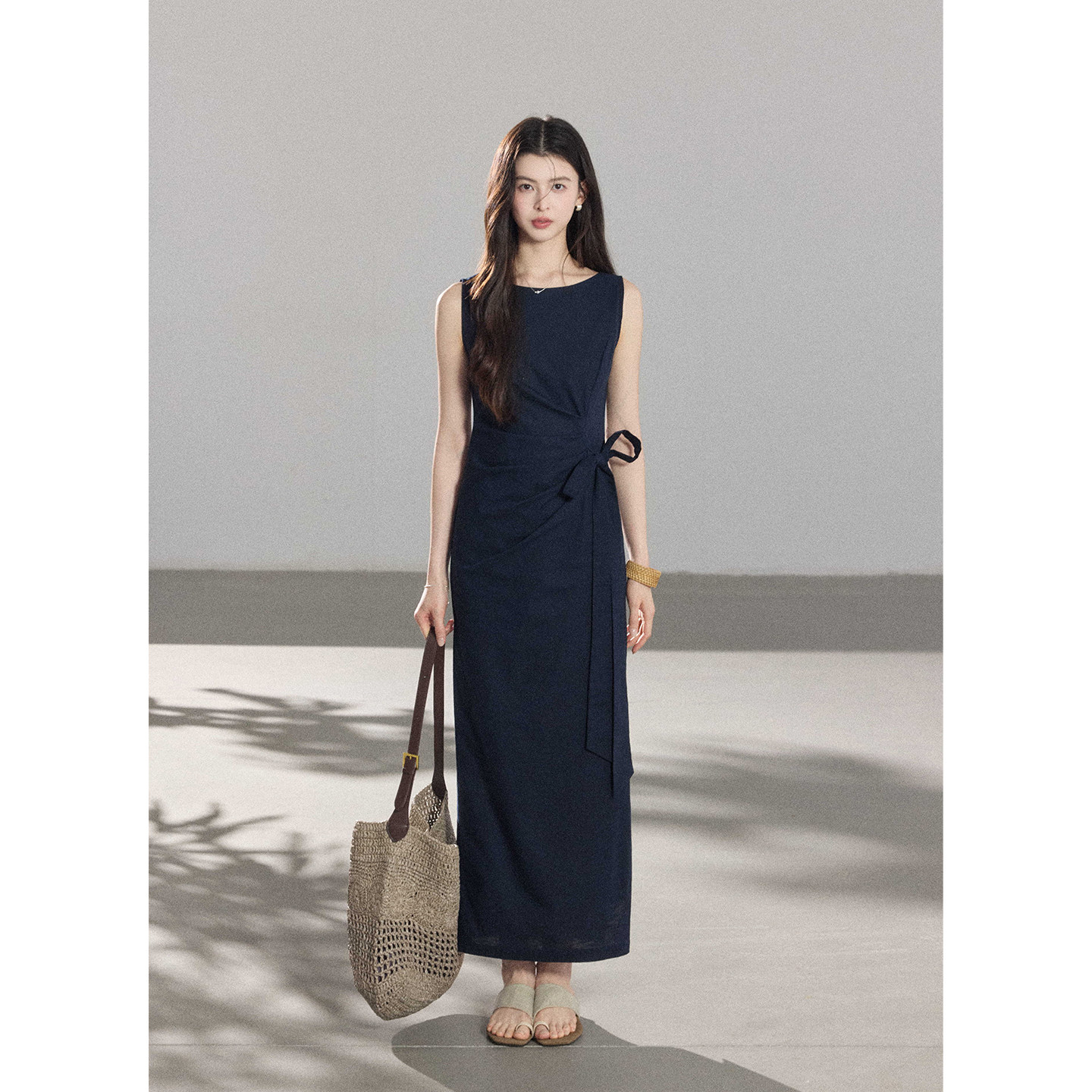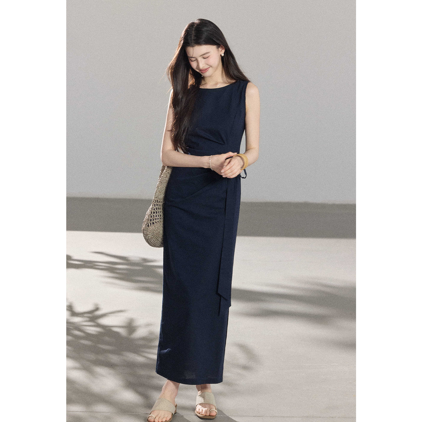 📚 贰羊设计【沐青】高级感气质收腰系带连衣裙女棉麻通勤百搭背心裙