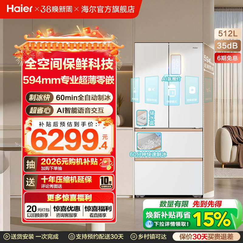 📚 海尔麦浪512Ultra制冰法式双开四门超薄零嵌入式家用风冷无霜冰箱