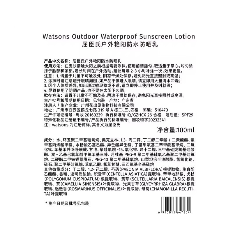 📚 大容量屈臣氏户外艳阳防水防晒乳霜SPF50+PA+++清爽轻透防紫外线