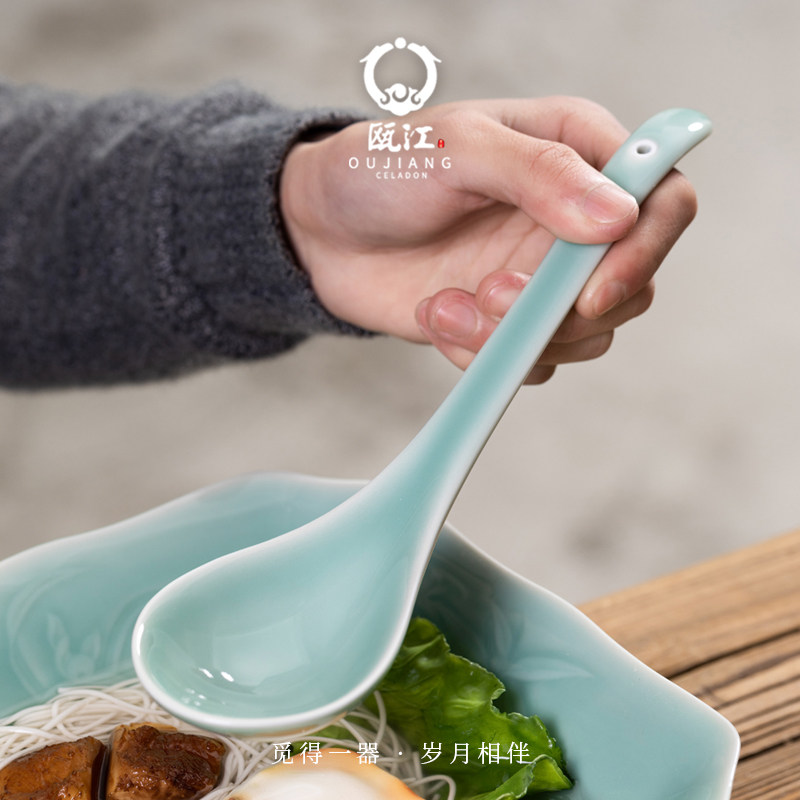 📚 瓯江龙泉青瓷汤匙创意家用月亮餐厅小汤勺陶瓷商用长柄汤匙餐具