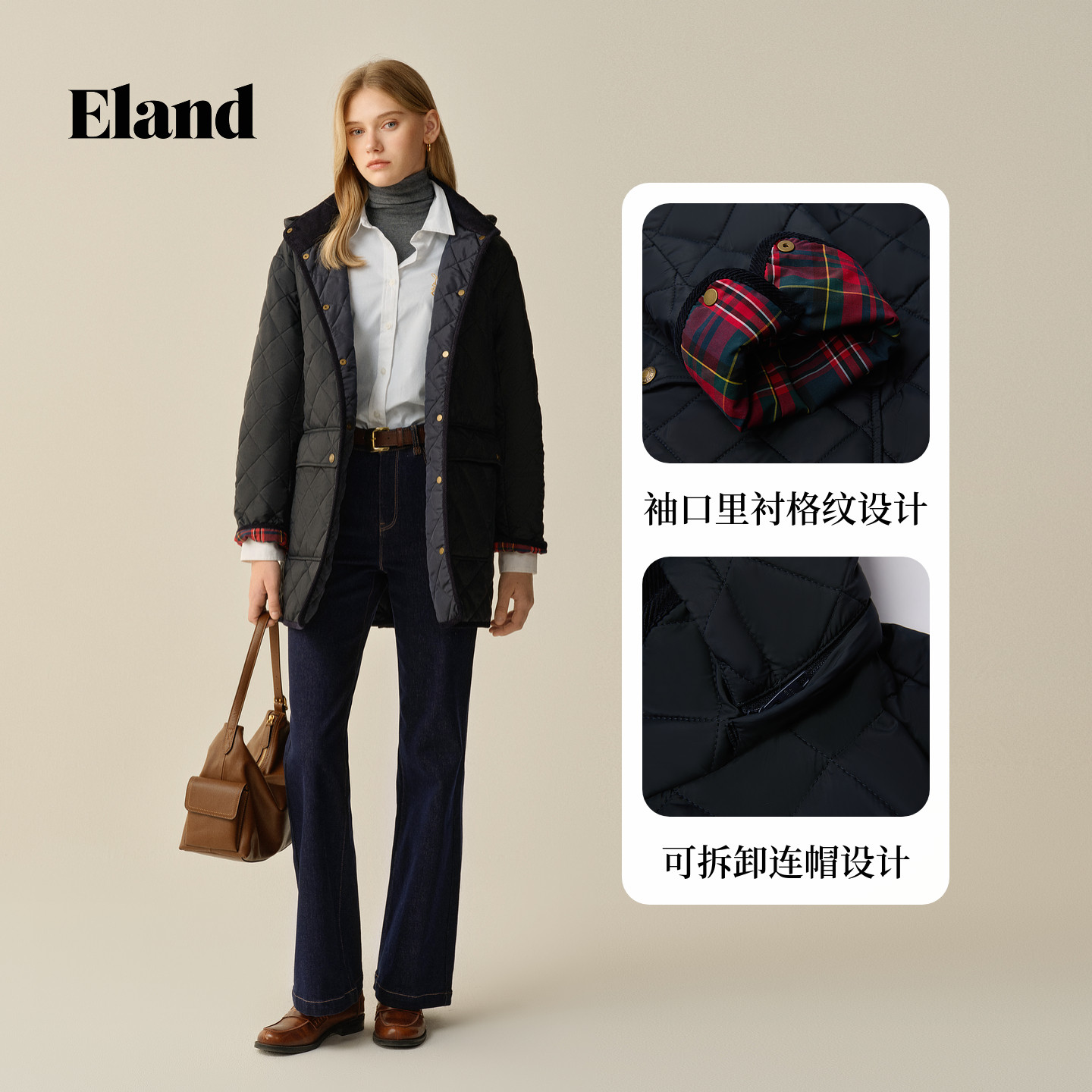 📚 【拒水科技】Eland衣恋棉服女中长款菱格连帽外套2025冬季新款