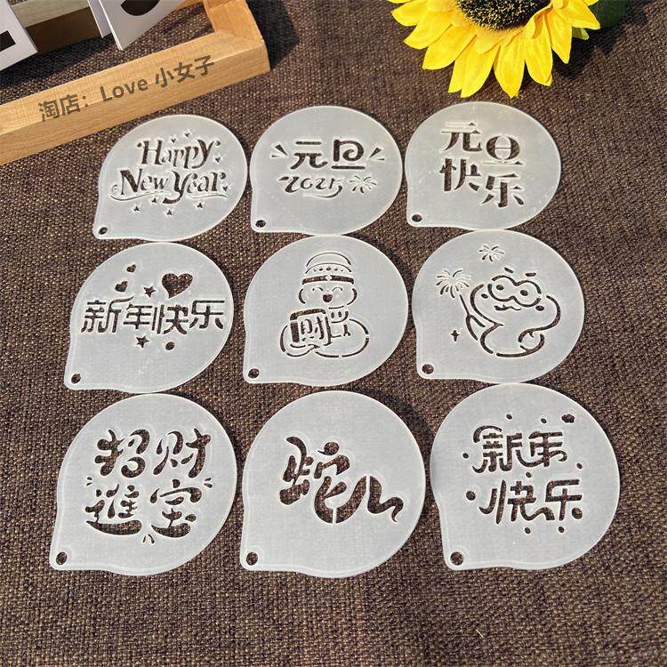 📚 元旦节咖啡拉花模具 元旦快乐2025图案糖粉筛喷花模 撒粉印花模