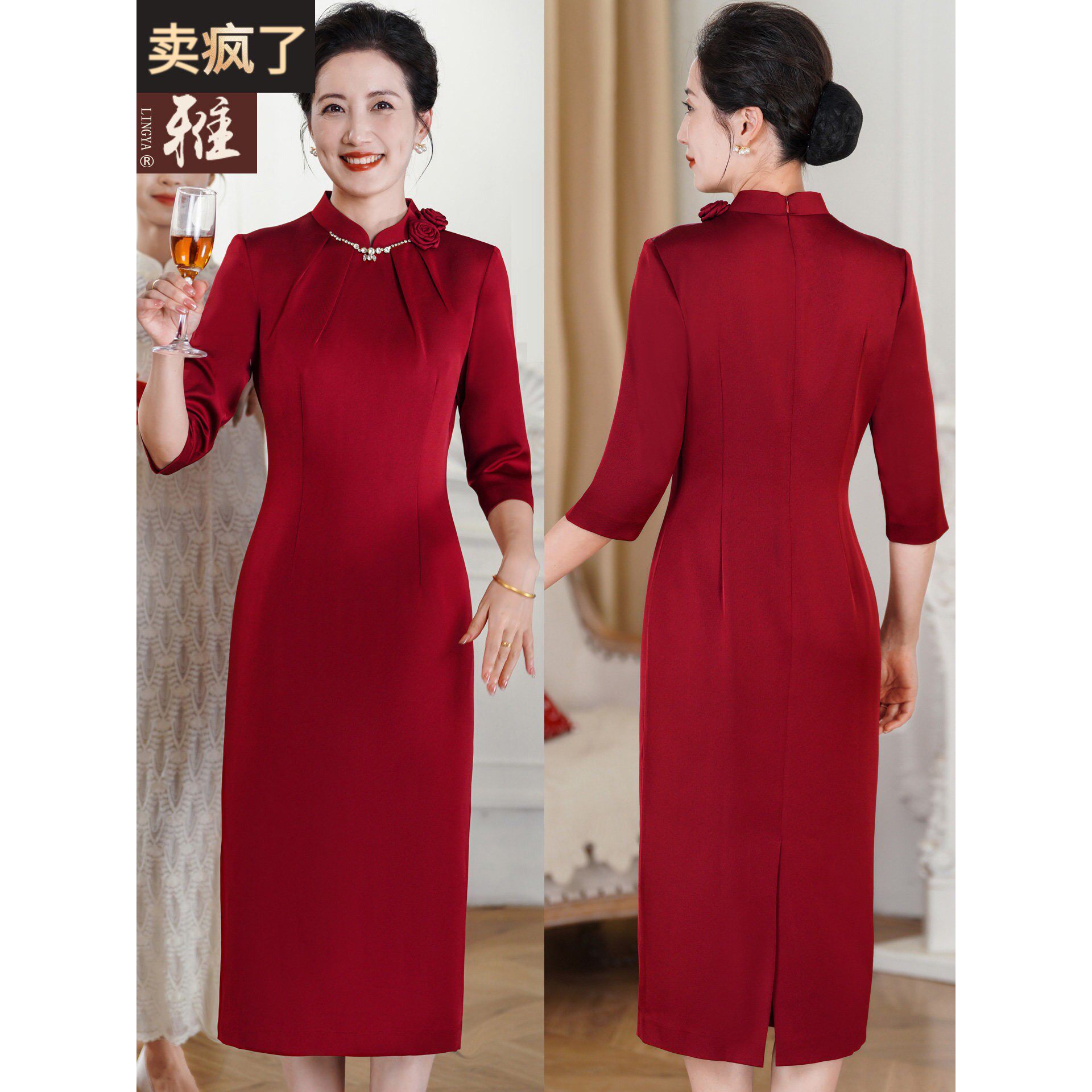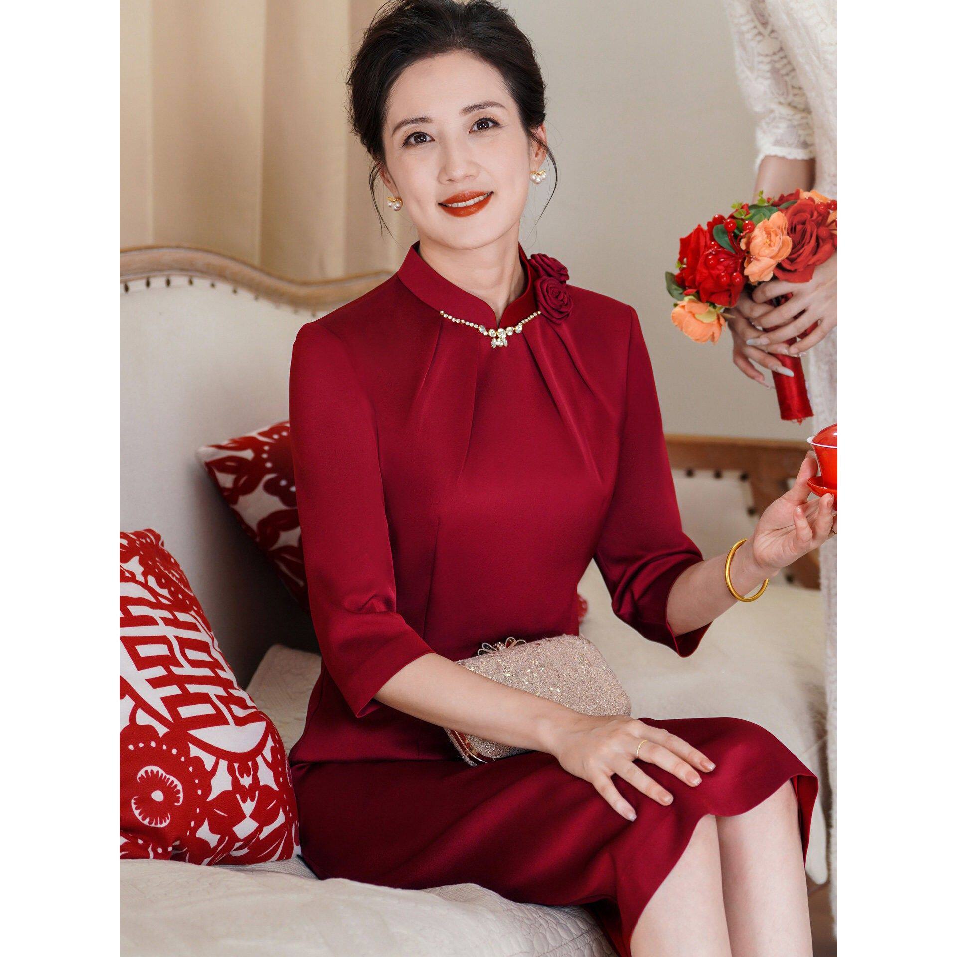 📚 喜婆婆彷醋酸结婚宴连衣裙钉珠晚礼服婚礼妈妈高贵修身显瘦旗袍裙