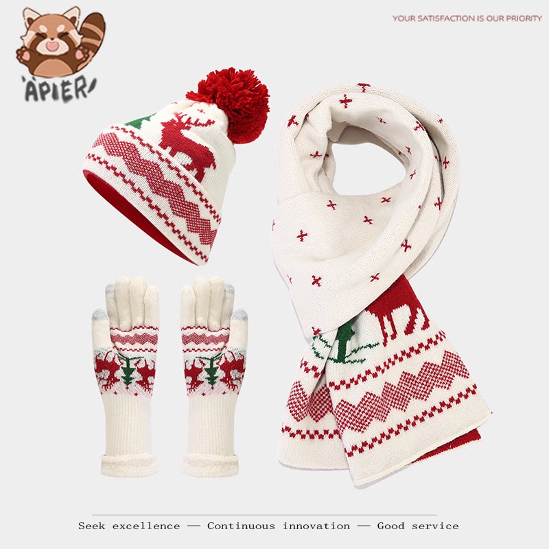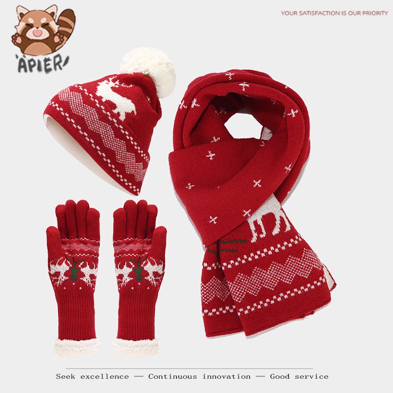 📚 本命年红色帽子围巾手套三件套麋鹿提花秋保暖针织套装圣诞防寒