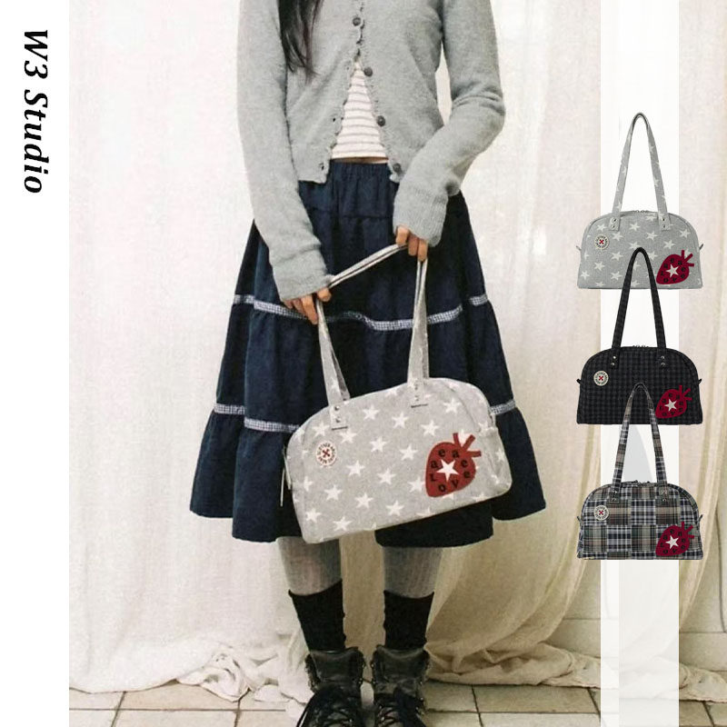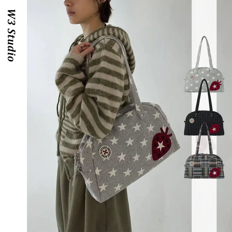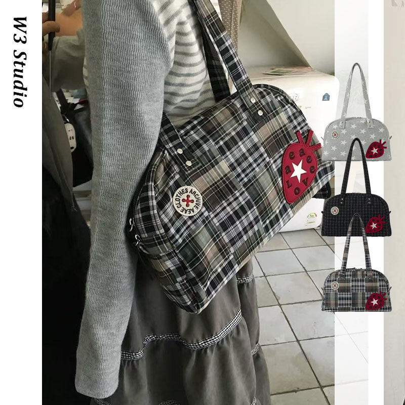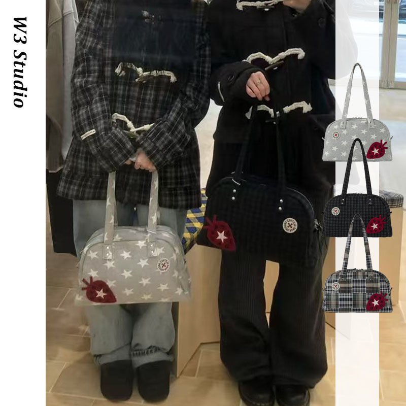 📚 韩国小众aeae学院风草莓贴布手提单肩腋下包星星格纹刺绣保龄球包
