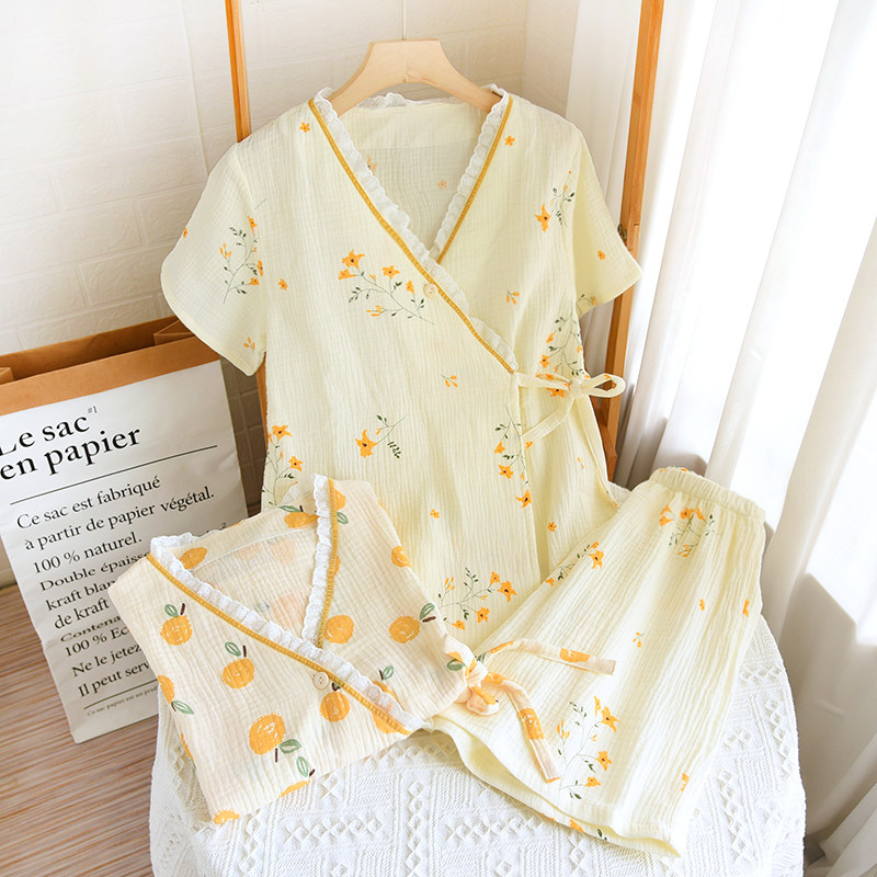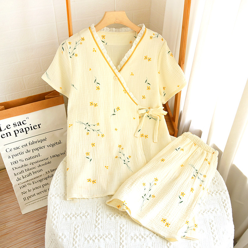 📚 日系清新和服短袖短裤睡衣套装女全棉麻绉布泡泡纱印花汗蒸服柔软