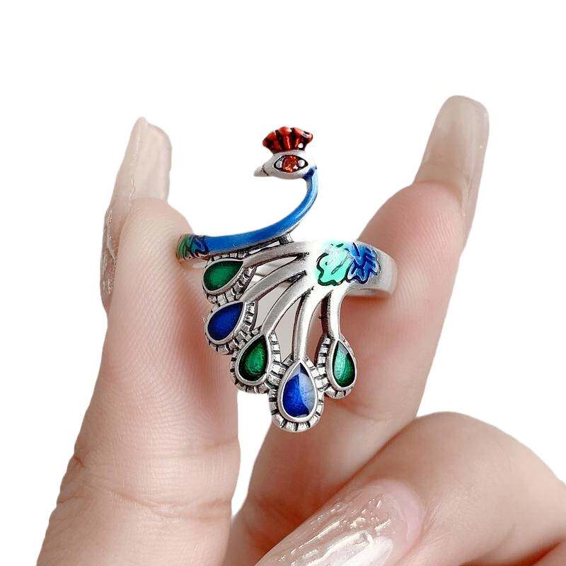 📚 新品彩色孔雀戒指女活口烧蓝工艺凤凰原创设计指环动物