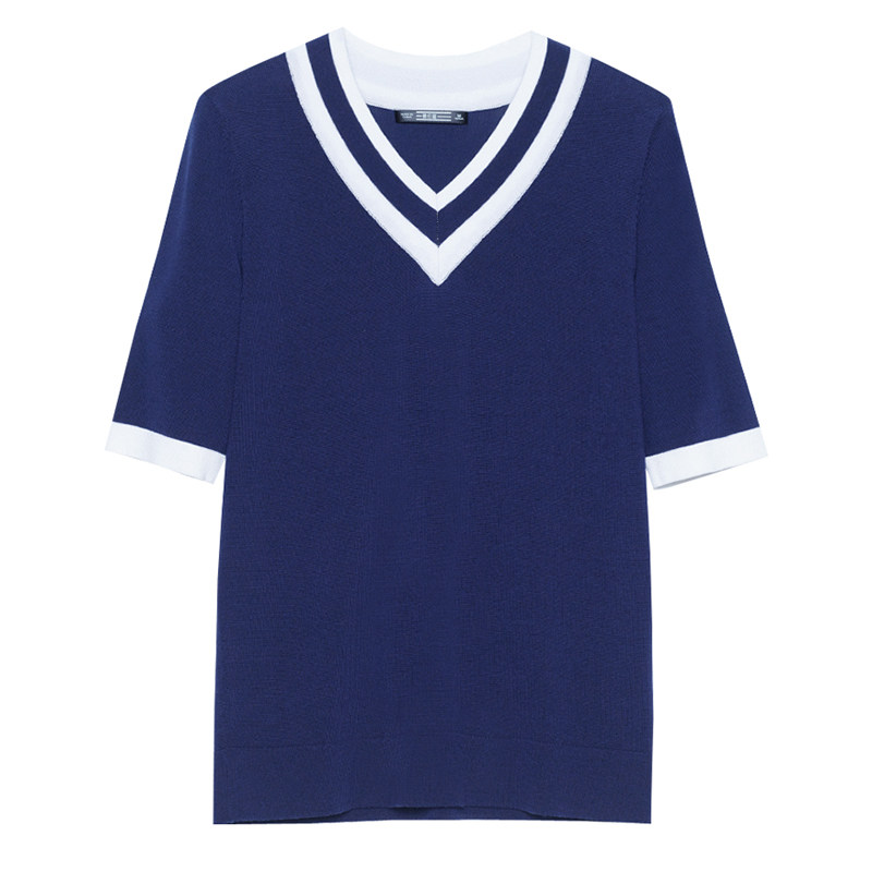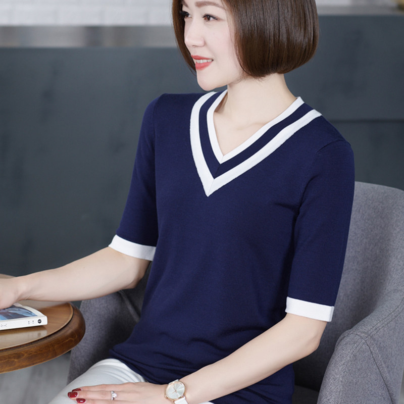 📚 横行道夏季纯色大码修身中袖针织衫上衣女套头V领半袖五分袖T恤
