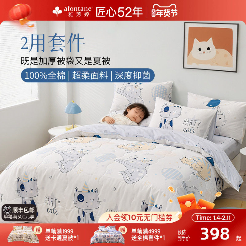 🎉大家好,今天我要给大家分享一款超级心水的床上四件套——雅芳婷床上四件套纯棉全棉卡通猫咪被套抑菌儿童四件套床笠款床品!👏