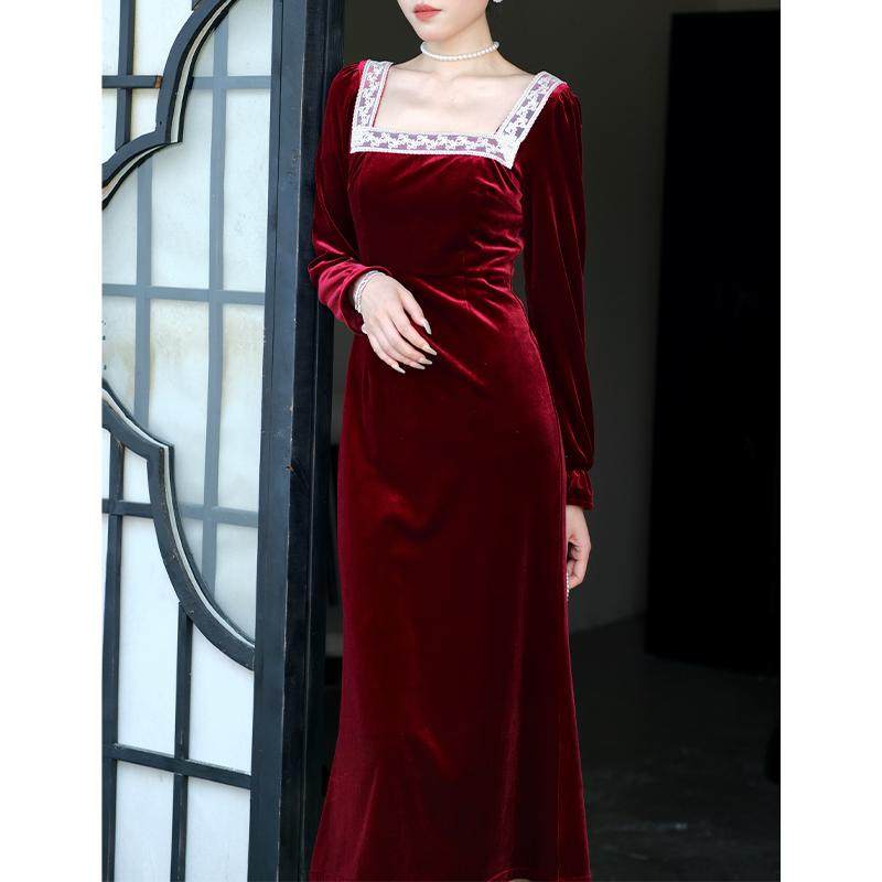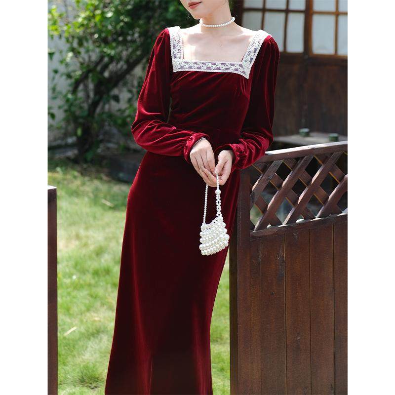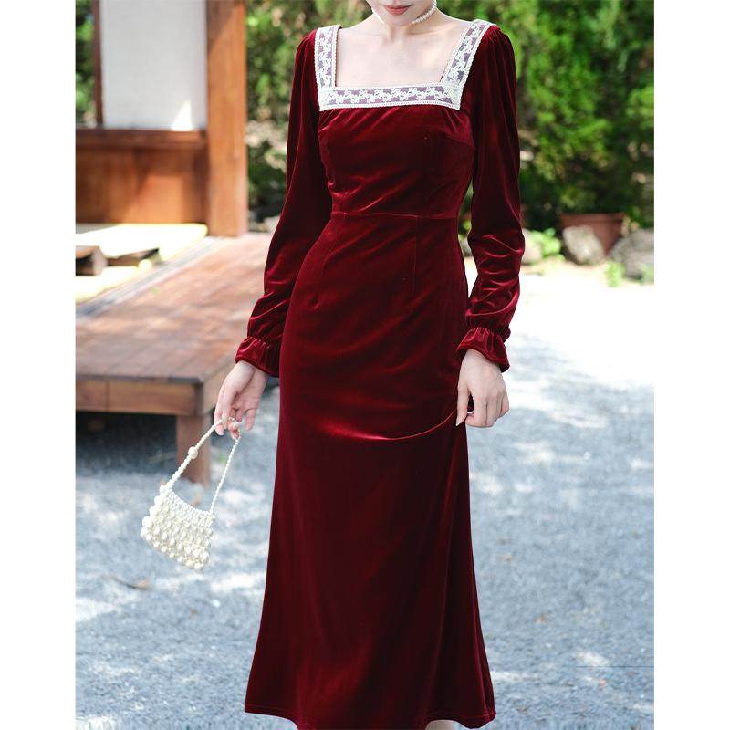 📚 鹿与玫瑰法式复古方领红色丝绒连衣裙女气质显瘦收腰订婚敬酒礼服