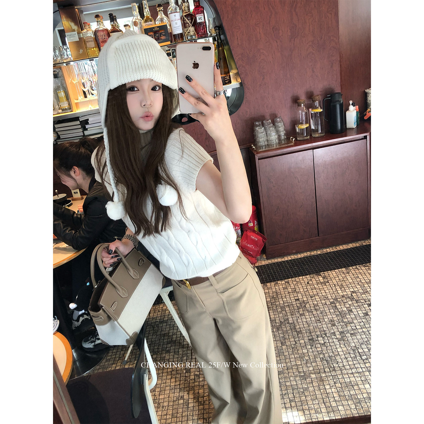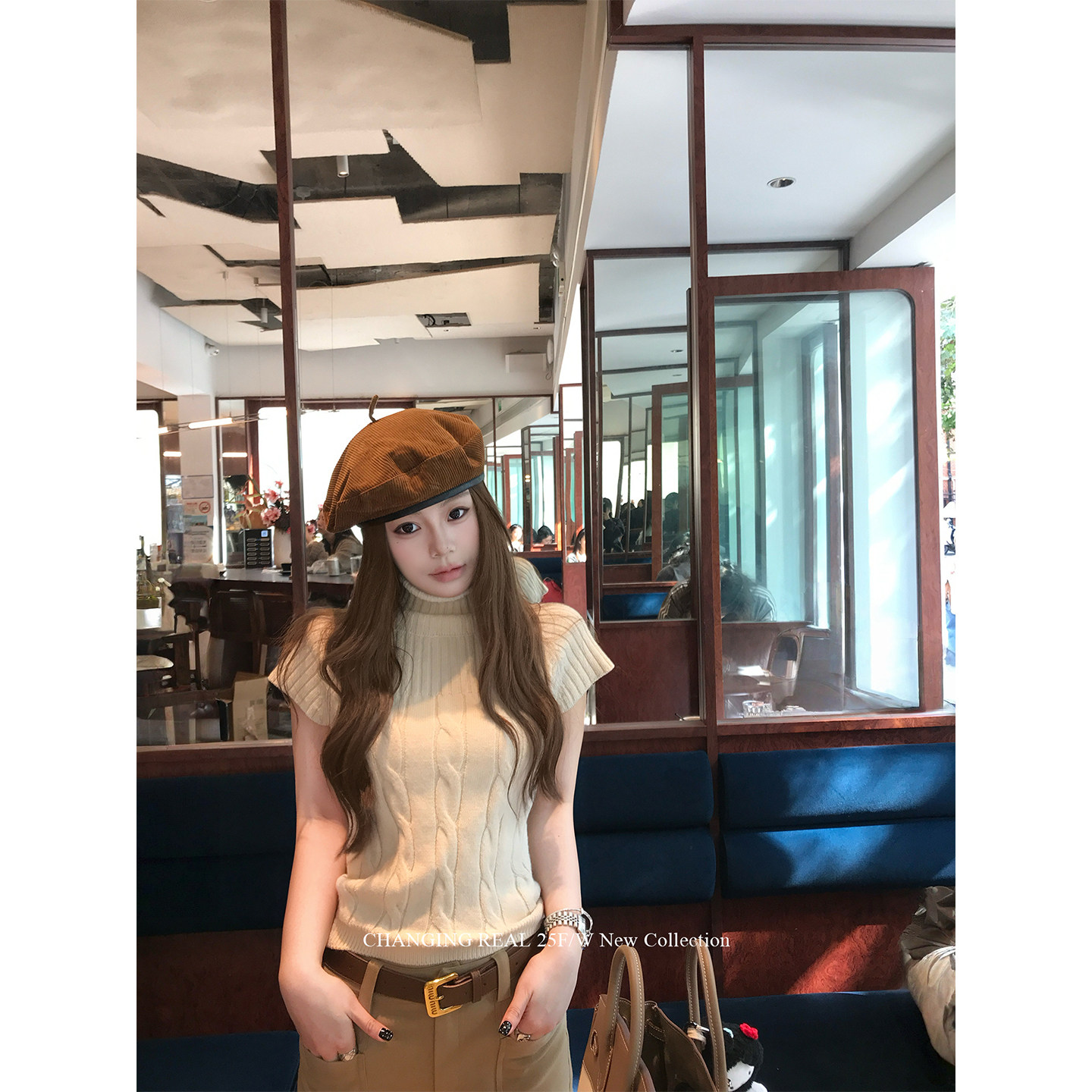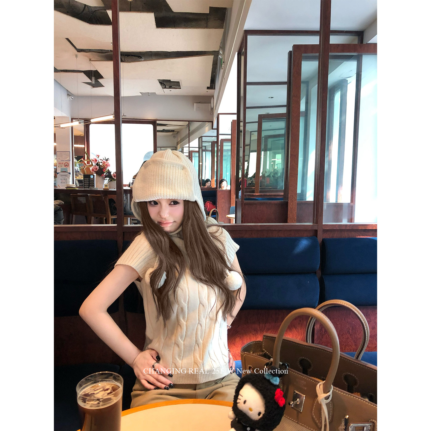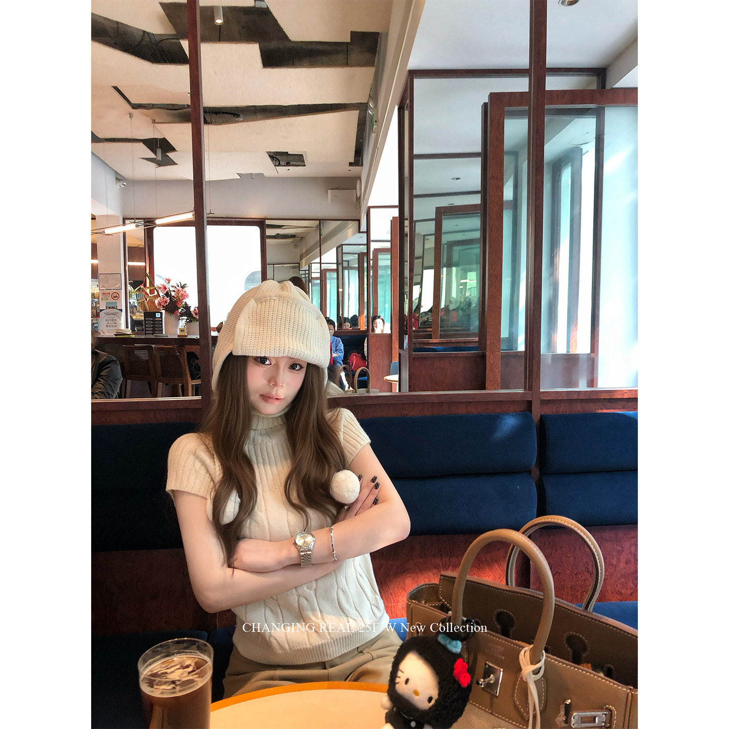 📚 CHANGING REAL 佩里月光 杏色高领麻花短袖毛衣软糯针织背心上衣