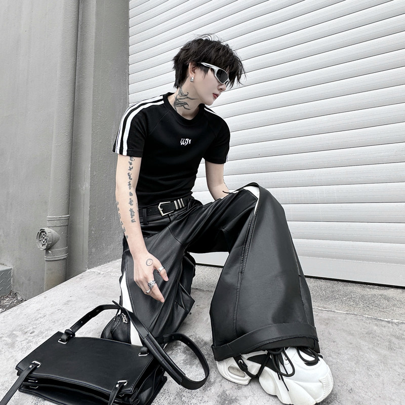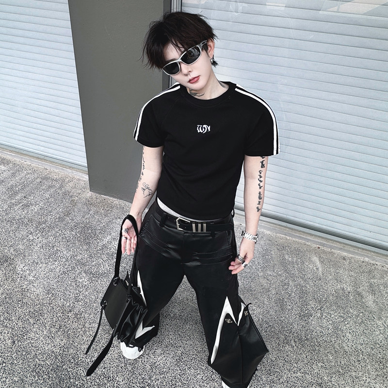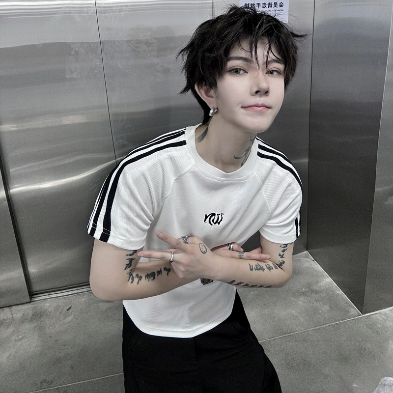 📚 夏季小众无性别内搭上衣三条杠插肩袖T恤超短款辣弟风修身打底衫