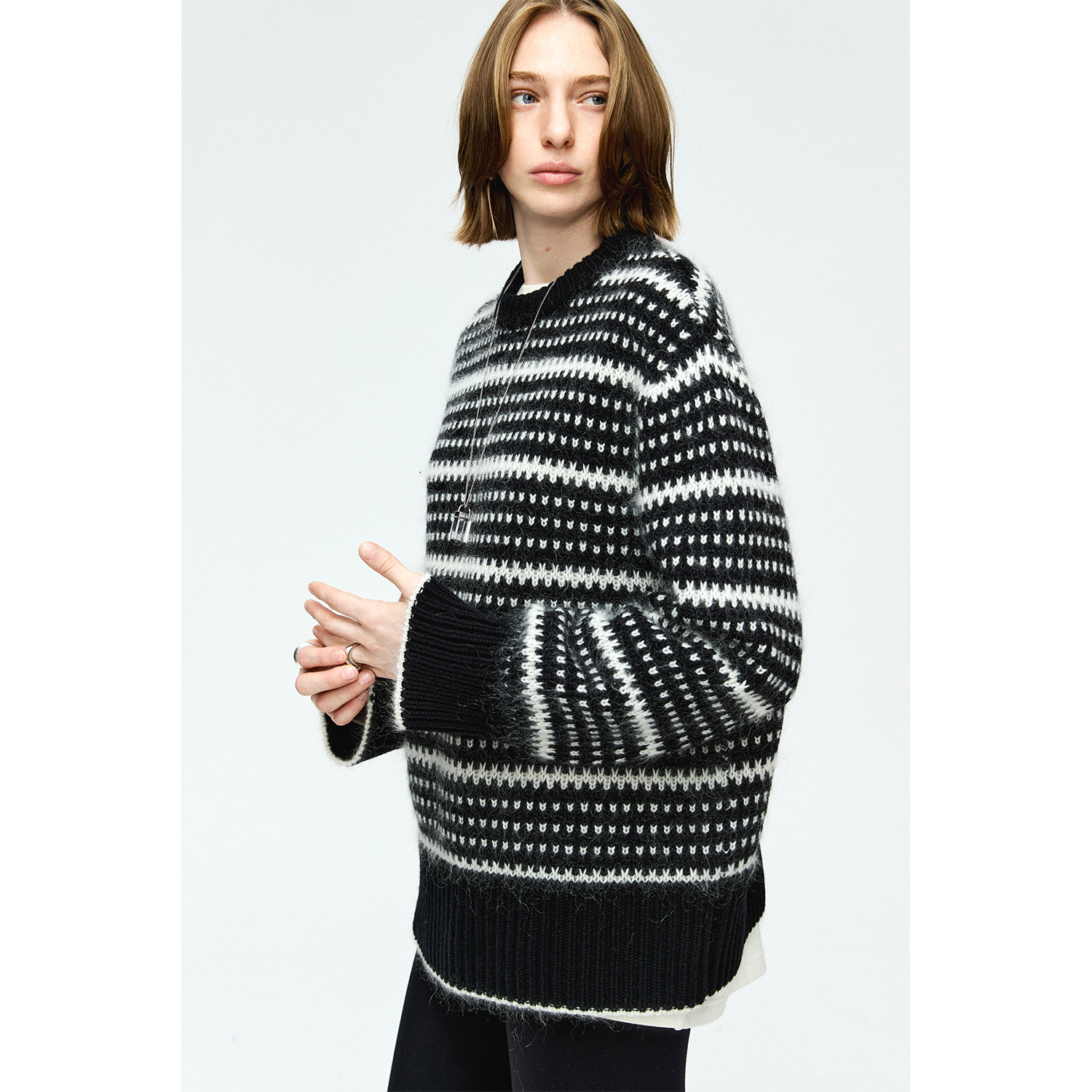 📚 MRS Studios 羊毛马海毛 提花阔版松弛感复古黑白大毛衣罩衫/帽子