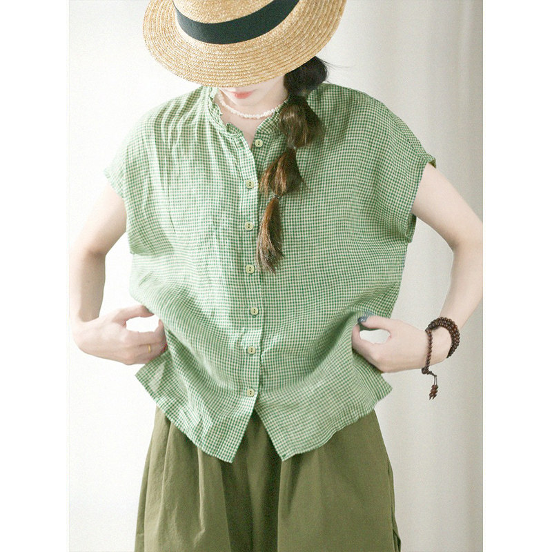 💥夏日新宠!谷家100%色织亚麻花边领短袖上衣,清凉透气,格子落肩小衫,让你爱不释手💖