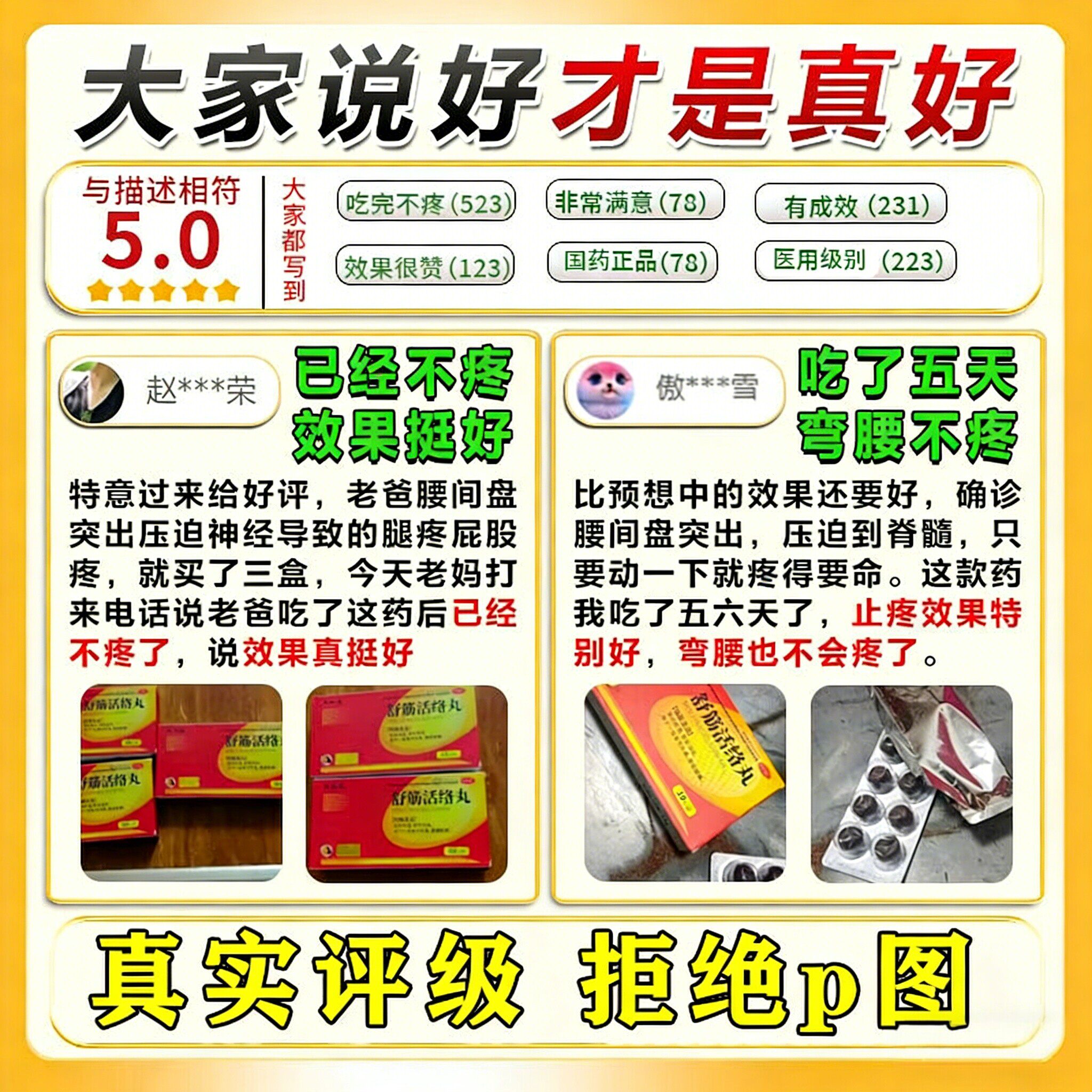 🍀这款舒筋活络丸的药效真的是太强大了!它能够活血化瘀、祛风除湿,对于腰椎间盘突出压迫神经的情况,真的是有很好的治疗效果。而且它的使用方法也非常简单,只需要按照说明书上的剂量服用即可。