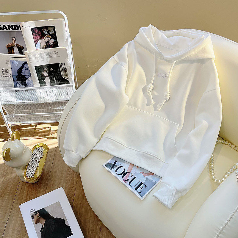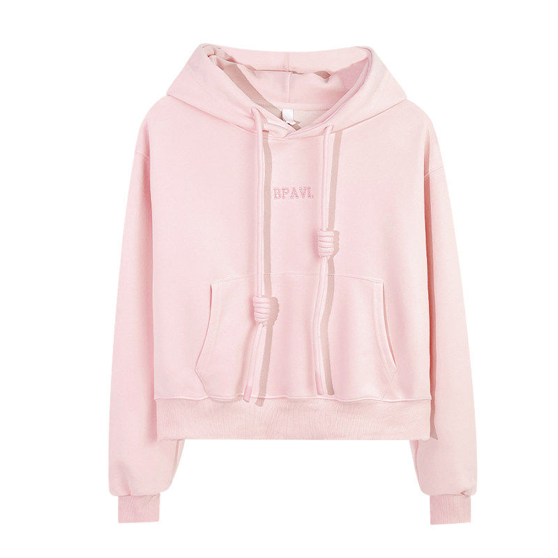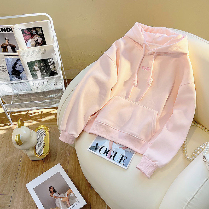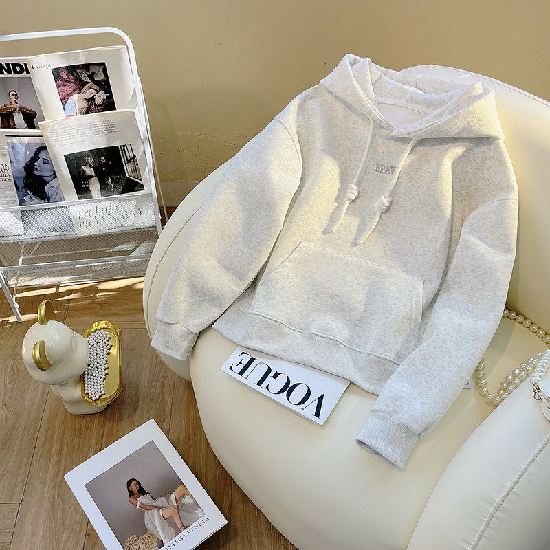 📚 花灰色刺绣字母小个子短款加绒卫衣女秋冬款初中高中学生百搭上衣