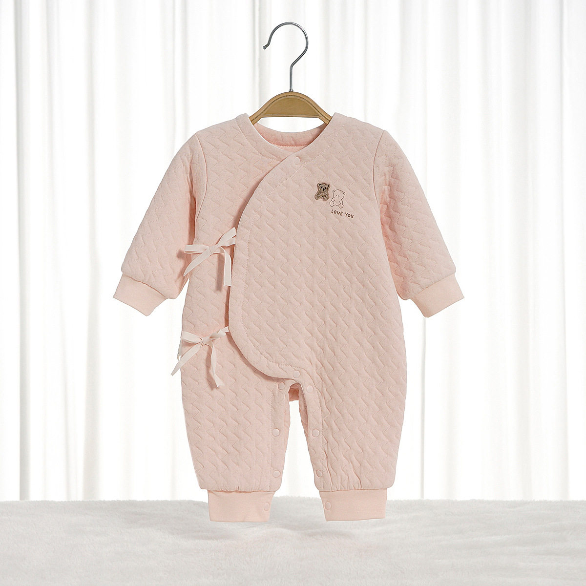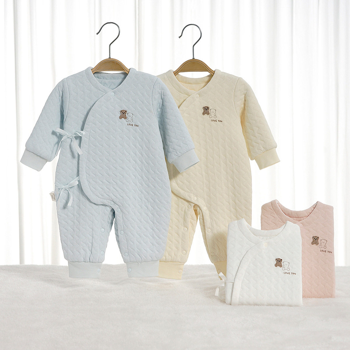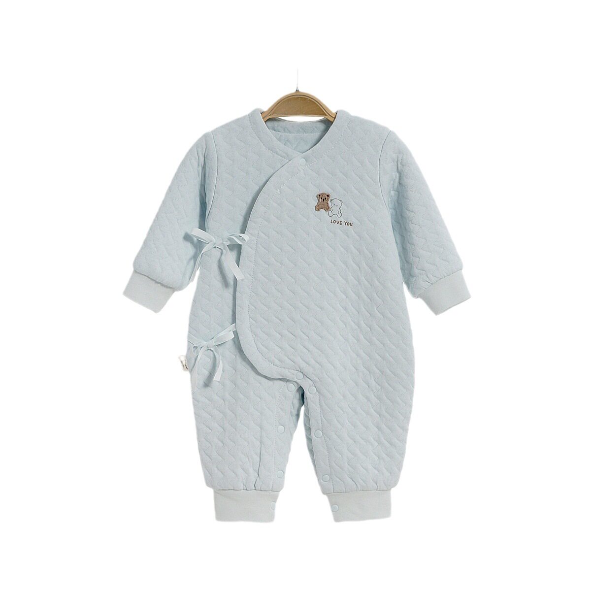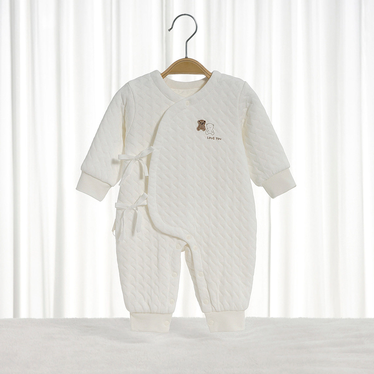 📚 新生儿衣服0-3个月波浪提花薄棉春秋季保暖初生婴儿绑带连体衣