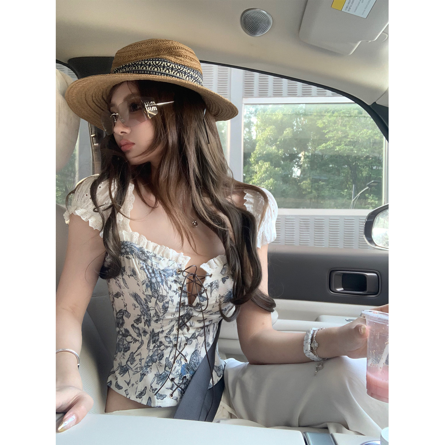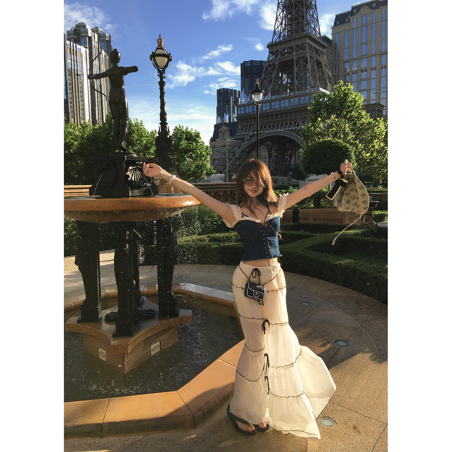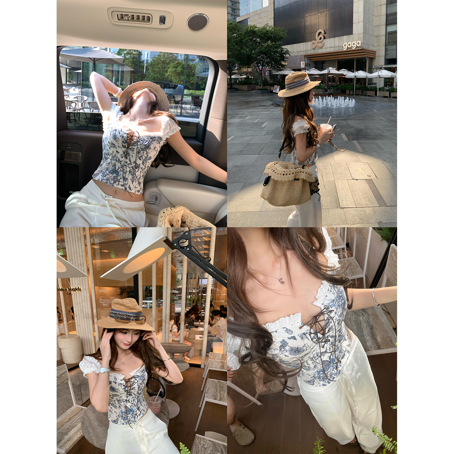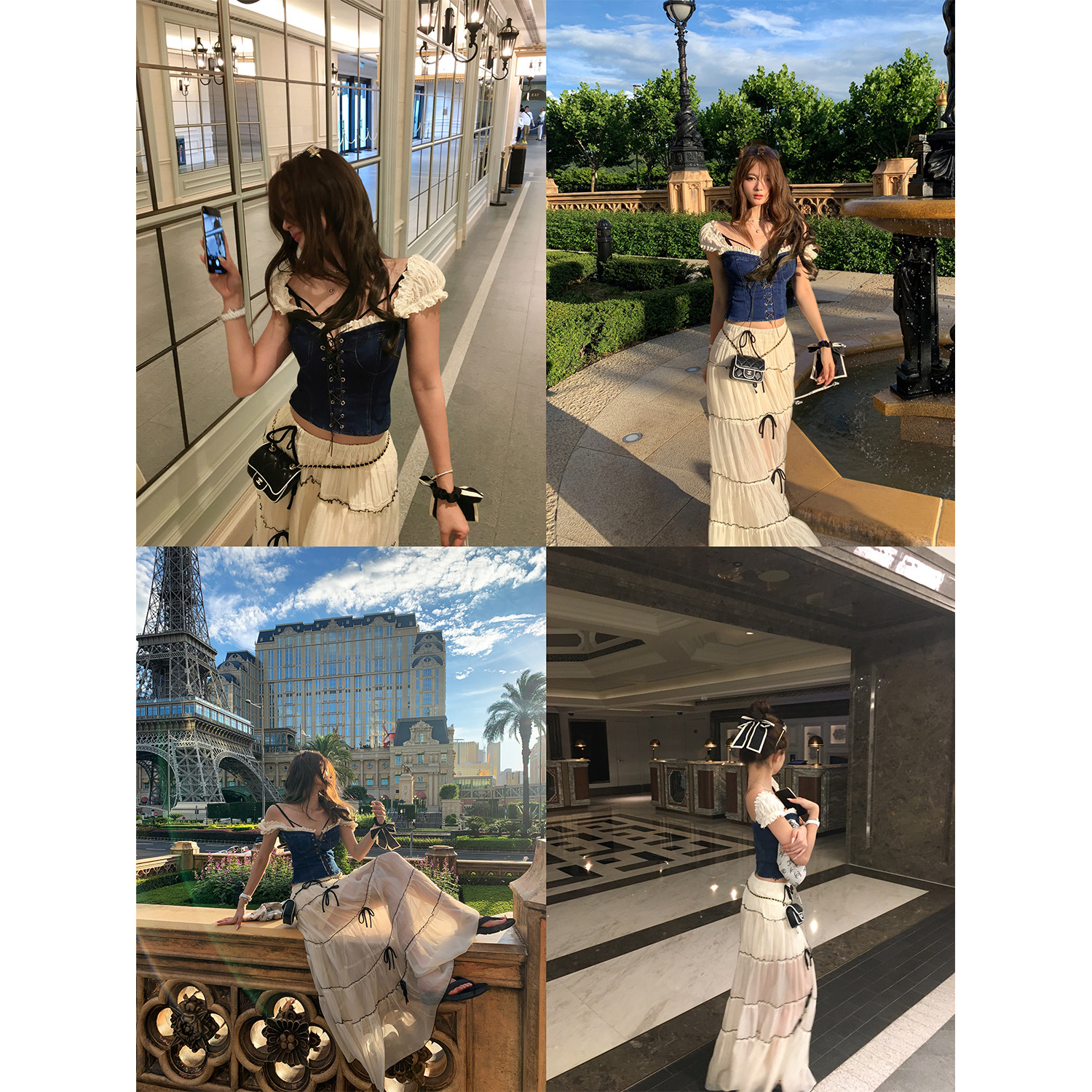 📚 Xinlei Lin“玛格丽特”微辣绑带法式复古牛仔印花拼接上衣/半裙