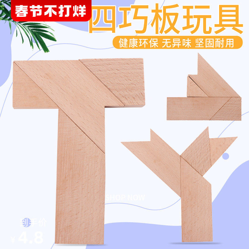 📚 木质T字之谜四巧板益智玩具成人学生儿童智力拼图彩色T字谜拼板